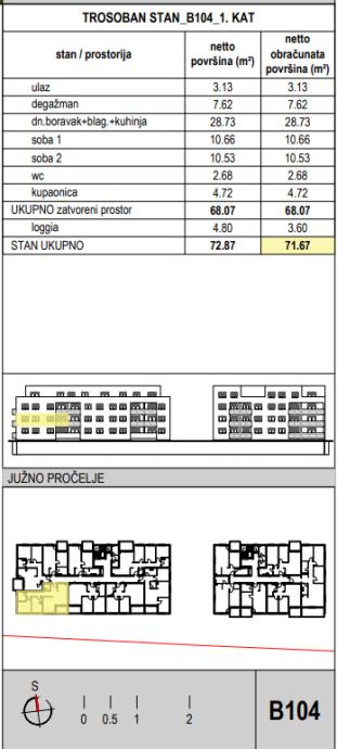 Stan se nalazi u sklopu projekta novogradnje. Projekt se u naravi sastoji od dva objekta sa zajedničkom garažom u kojoj se nalaze spremišta i garažna parkirna mjesta. U Zgradu A i B moguće je ući stepenicama ili liftom odmah iz podzemne garaže ili iz prizemlja s glavnog ulaza. Zgrada A sastoji se od 21 stana, a zgrada B od 29 stanova koji se nalaze na prizemlju, 1. katu, 2. katu i 3. katu. Zadnji kat izvesti će se kao uvučeni s većim terasama. Zgrade će biti izvedene kao dva odvojena kubusa zbog veće osunčanosti stanova te u svrhu smanjenja agresivne izgrađenosti koja utječe na okoliš.