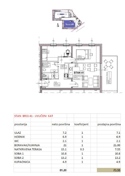 Stan S41 prodaje se u sklopu projekta stambene građevine Zaprešić. Smješten je na trećem katu zgrade 2 te se sastoji od ulaza, hodnika, wca, boravka/kuhinje, kupaonice, natkrivene terase i dvije spavaće sobe.