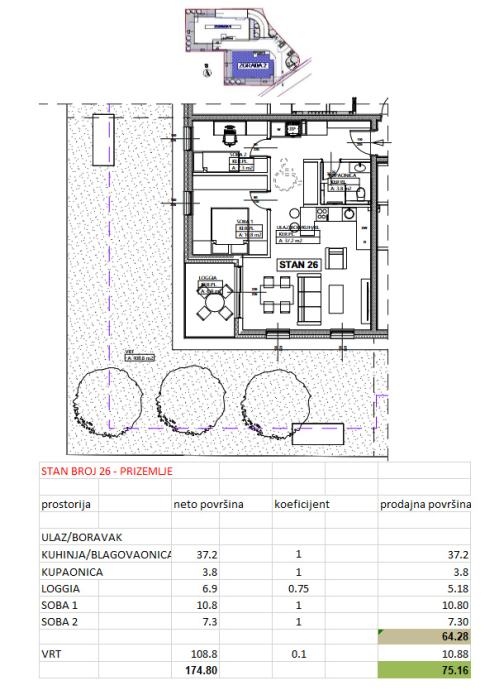Stan S26 prodaje se u sklopu projekta stambene građevine Zaprešić. Smješten je u prizemlju zgrade 2 te se sastoji od ulaza/boravka/kuhinje/blagovaone, kupaonice, loggie, dvije spavaće sobe i vrta.