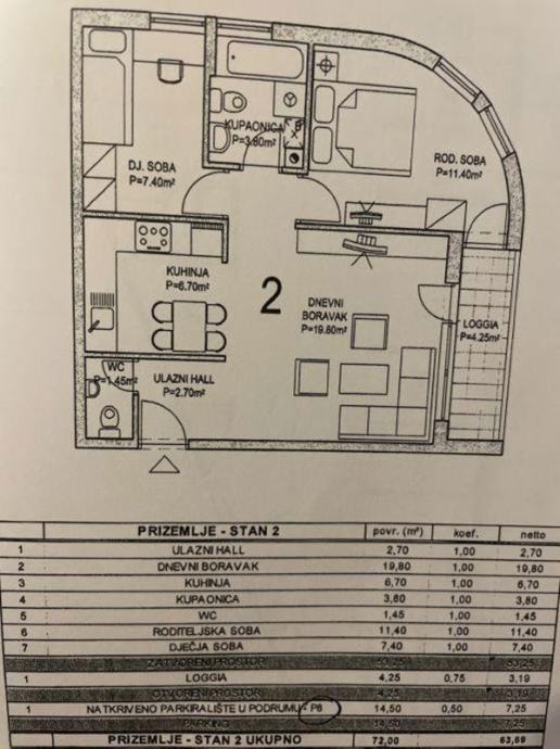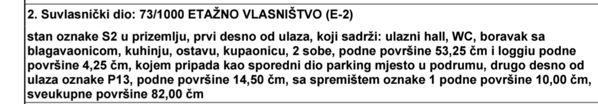 Stan u centru Zaprešića. Zgrada iz 2008. Stan je unutarnje površine oko 60m2 dok je ukupna obračunska površina (s garažnim parkirnim mjestom i spremištem) 82m2. Sastoji se od dvije spavaće sobe, open-space kuhinje, dnevnog boravka i blagovaonice, kupaonice s WC-om, predsoblje, još jedan WC, balkon (loggia). Uz stan dolaze garažno parkirno mjesto i skladište (posebna privatna prostorija u podrumu od 10m2 sa metalnim vratima) uz samo parkirno mjesto. Neposredna blizina autobusa ZET, željezničke stanice Zaprešić-Savska. U užem krugu stana su dom zdravlja, vrtić, pošta, policija, brojne trgovine (Muller, Plodine...), ljekarna, frizerski saloni. Stolarija, podovi, instalacije, grijanje, sve je u originalnom stanju, održavano i gotovo kao novo. Nije potrebna apsolutna nikakva adaptacija. Za stan sva papirologija dostupna odmah: uporabna dozvola, novi energetski certifikat, vlasnički list, ZKI...
