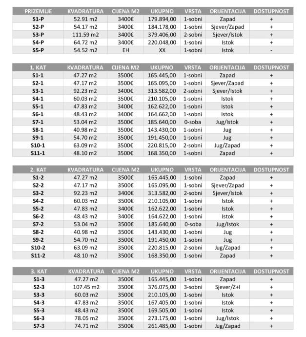Postoji mogućnost kupnje jednog ili više garažnih parkirnih mjesta po cijeni od 25.000,00 € i 30.000,00 €, kao i spremišta kojih je u zgradi ukupno 18. Građevinska dozvola je ishodovana. Kupac je oslobođen plaćanja poreza na promet nekretninama, a budući da je investitor u sustavu PDV-a, kupci koji ispunjavaju uvjete imaju mogućnost povrata polovice plaćenog PDV-a.