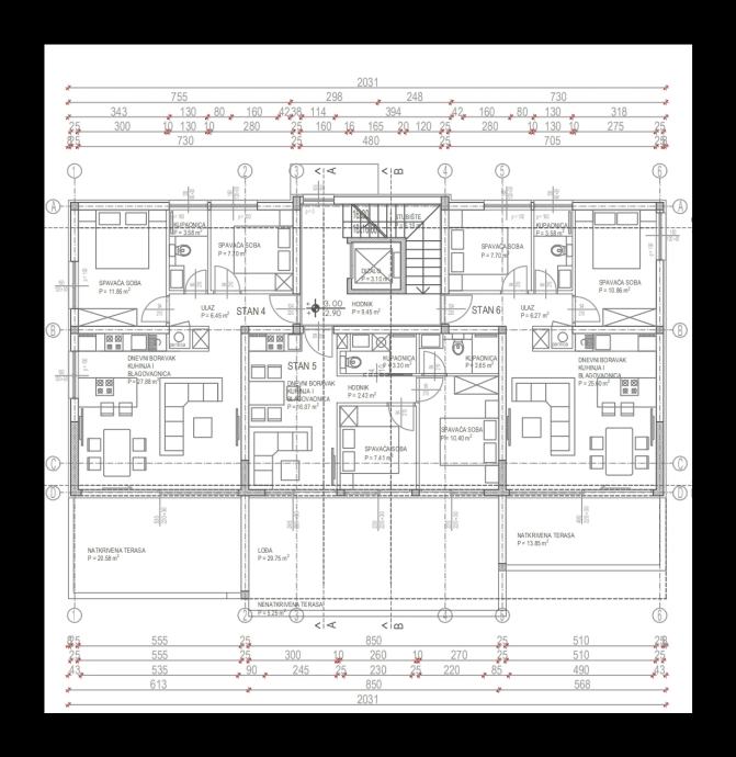 Prodaje se dvosobni stan površine 74.90 m2 na prvom katu s pogledom na more na samo 20ak metara od mora. Stan se sastoji od kuhinje i dnevnog boravka iz kojeg se izlazi na prostranu terasu, dvije spavaće sobe i kupaonicom. Apartman ima ugrađenu aluminijsku stolariju s elektro roletama i žaluzinama na staklenim stijenama (Schüco). Stambena zgrada opremljena je modernim dizalom. Stan je opremljen klima uređajima marke Mitsubishi, u kuhinjskom dijelu i kupaonici postavljena je prvoklasna keramika velikog profila, dok je ostalom dijelu stana postavljen parket. Apartmanu pripadaju dva parkirna mjesta,