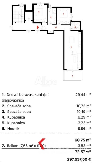 Predmetni stan oznake B2 smješten je na prvom katu stambene zgrade, a zgrada se sastoji od prizemlja i 3 kata. Ukupna neto stambena površina stana je 72,57m2, a sastoji se od: dnevni boravak, kuhinja i blagovaonica, spavaća soba 1,spavaća soba 2, 2 kupaonice, ulazni hodnik.