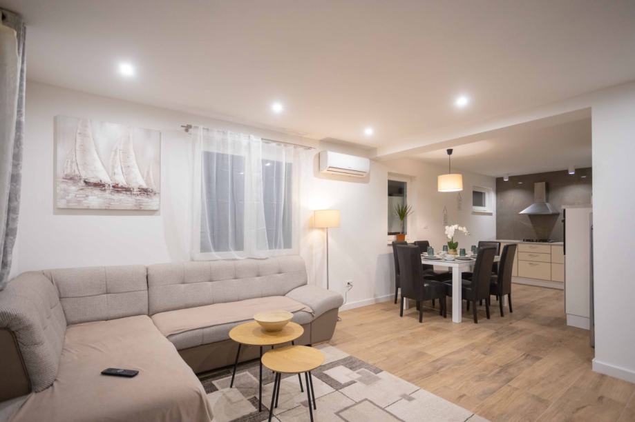 Stan se nalazi u prizemlju kuće, ima 90 m2, a sastoji se od dvije spavaće sobe, kuhinje s blagovaonom, dnevnog boravka, dvije kupaonice i terase s predivnim pogledom.