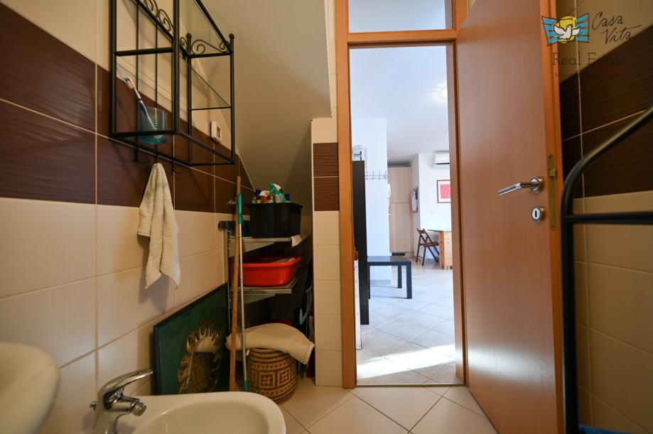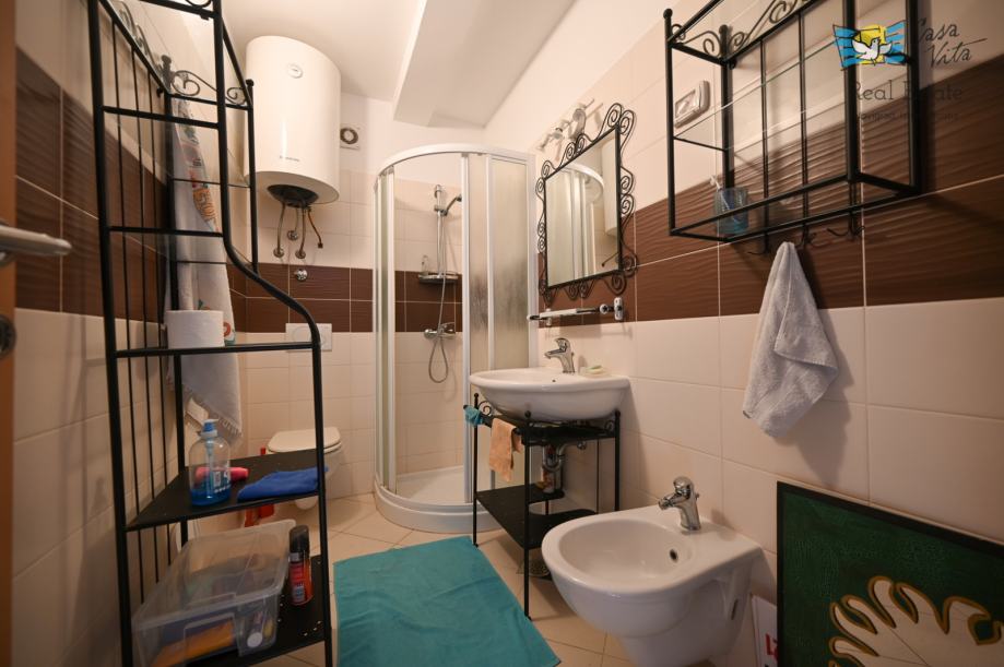 Ovaj stan nudi funkcionalan prostor s jednom spavaćom sobom, što ga čini idealnim za samce, parove ili kao investiciju za turistički najam. Orijentacija na jugozapad omogućuje prirodnu svjetlost tijekom dana, stvarajući ugodnu atmosferu. Stan je opremljen kuhinjom s aparatima, perilicom posuđa, TV-om te krevetom, što dodatno doprinosi praktičnosti i udobnosti svakodnevnog života.