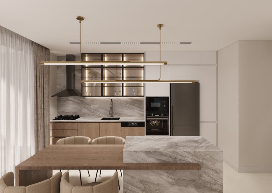 Stanovi se sastoje od prostranog open space dijela koji uključuje kuhinju, blagovaonicu i dnevni boravak (35,21 m²). U stanu se nalaze dvije udobne spavaće sobe (13,13 m² i 12,59 m²), moderno uređena kupaonica (4,27 m²), odvojeni WC (1,69 m²), praonica/vešeraj (1,94 m²) te funkcionalan hodnik (6,31 m²) koji povezuje sve prostorije u logičan i skladan tlocrt. Stanovi od 1. do 4. kata imaju prostrane lođe s kojih se pruža očaravajući pogled na Trogirski zaljev – savršeno mjesto za jutarnju kavu ili večernje opuštanje uz zalazak sunca.