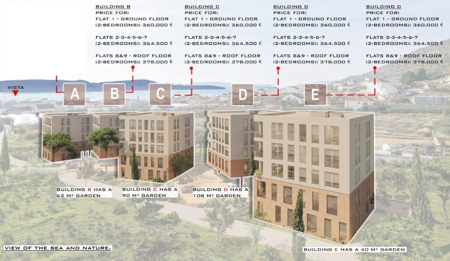 Predstavljamo vam novi stambeni kompleks s pet moderno izgrađenih zgrada (A, B, C, D, E), smješten u mirnom sjevernom dijelu Segeta Donjeg, nedaleko od povijesnog grada Trogira.