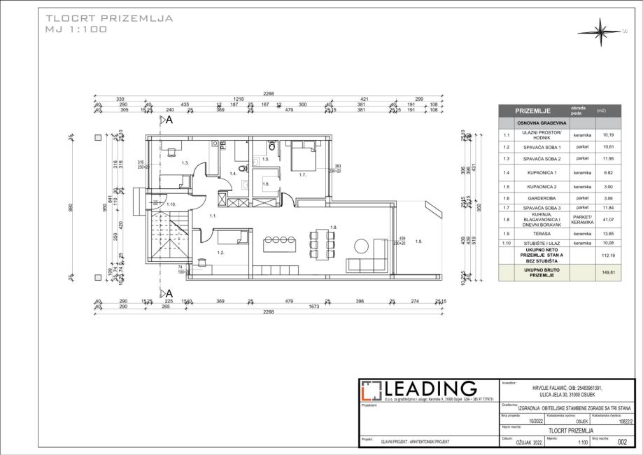 ČETVEROSOBAN STAN U PRIZEMLJU POVRŠINE 112,19m2...sastoji se od ulaznog prostora, dvije spavaće sobe, roditeljskog apartmana sa garderobom i kupaonicom, kupaonice 2, dnevne sobe s kuhinjom i blagovaonicom s izlazom na terasu površine 13,65 m2, te pripadajući kućni vrt i parkirališno mjesto. PRODANO!
