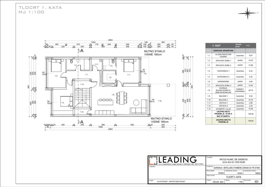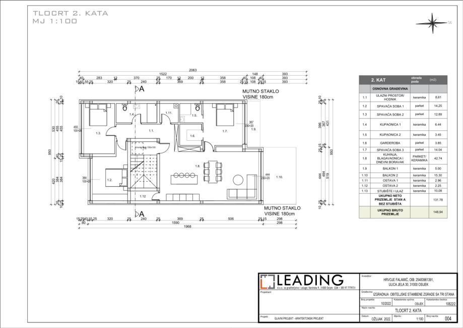 ČETVEROSOBNI STANOVI NA 1 i 2 KATU POVRŠINE 131,78m2...sastoje se od ulaznog prostora, dvije spavaće sobe, roditeljskog apartmana sa garderobom i kupaonicom, kupaonice 2, ostave, dnevne sobe s kuhinjom i blagovaonicom s izlazom na balkon površine 15,30 m2, te pripadjuće parkirališno mjesto...investitor prodaje stanove kompletno namještene!