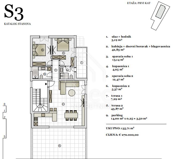 Stan S3 se nalazi na prvom katu, površine 135,71 m2. Sastoji se od ulaza i hodnika, kuhinje i blagovaonice s dnevnim boravkom i izlazom na prostranu terasu. Tu su još dvije kupaonice i dvije spavaće sobe. Jedna spavaća soba je master, s vlastitom kupaonicom i terasom. Stanu pripada jedno parking mjesto.