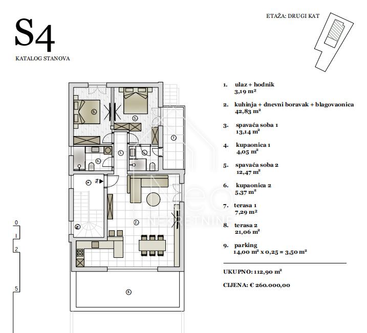 Stan S4 se nalazi na drugom katu i površine je 112,90 m2. Sastoji se od ulaza i hodnika, dnevnog boravka, kuhinje i blagovaonice s izlazom na terasu, dvije kupaonice, dvije spavaće sobe od kojih jedna master s vlastitom kupaonicom i terasom. Pripada mu jedno parking mjesto.
