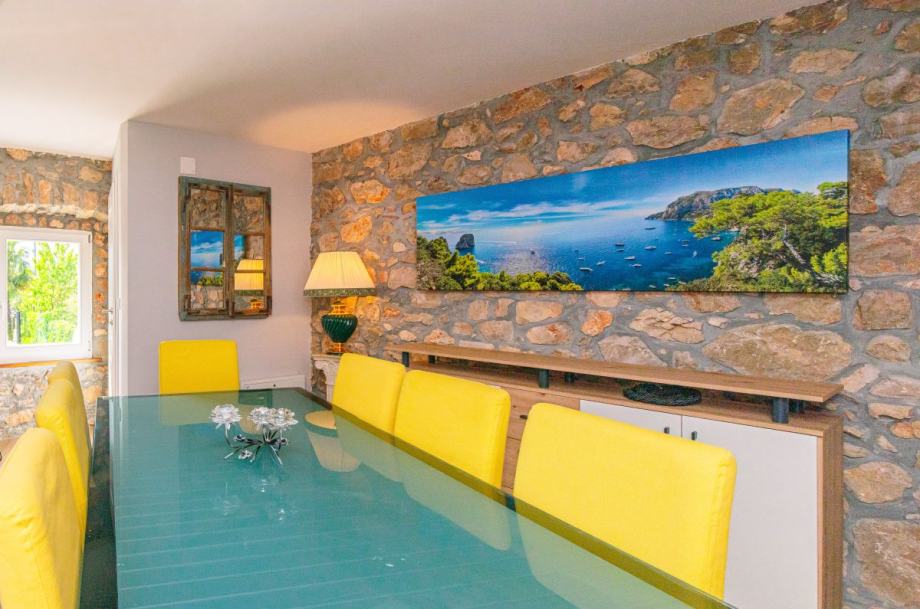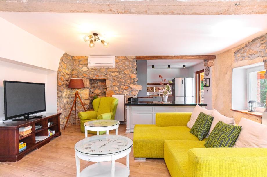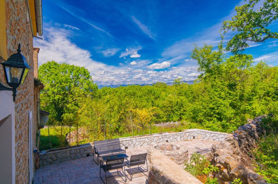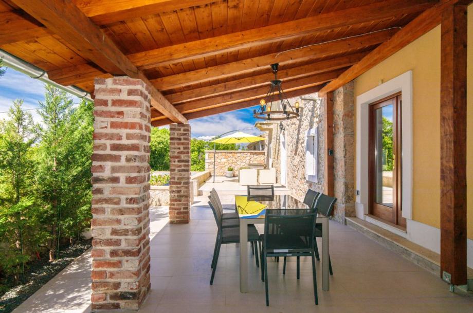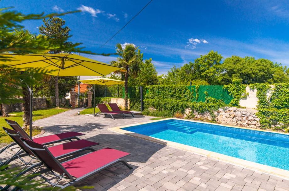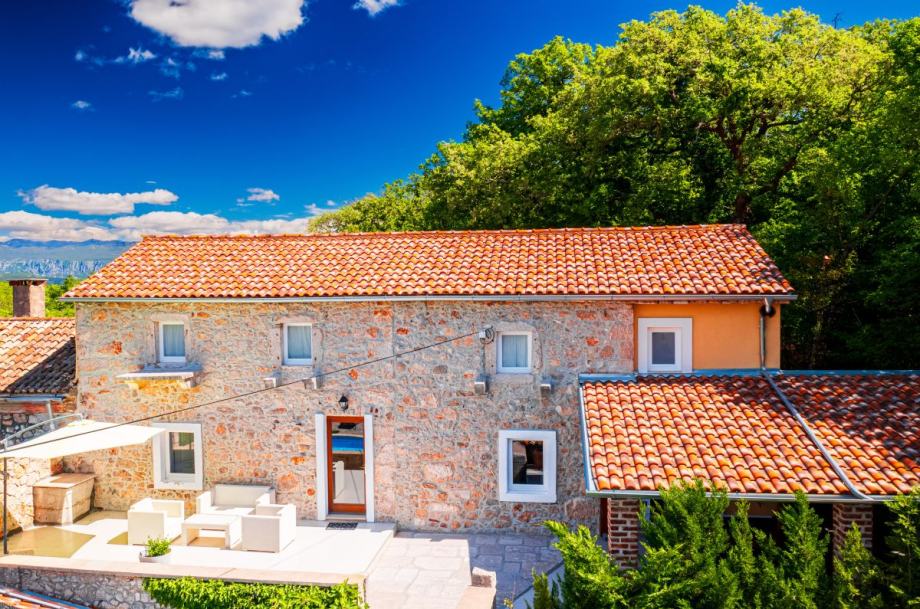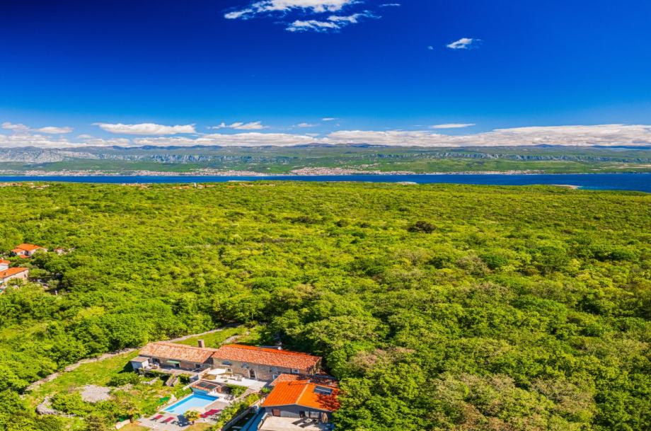 Otok Krk, Dobrinj, šire područje, prodaja uređene kamene vile površine 214 m2, s grijanim bazenom i uređenom okućnicom površine 351 m2, na mirnoj lokaciji, 3000 m od mora. Vila se sastoji od podruma s prostorom za druženje i toaletom, prizemlja s dnevnom sobom, kuhinjom, blagovaonom, toaletom i terasom te prvog kata s tri spavaće sobe s vlastitim kupaonicama. Klimatizacija, podno grijanje, vanjski kamin, dva parkirna mjesta.