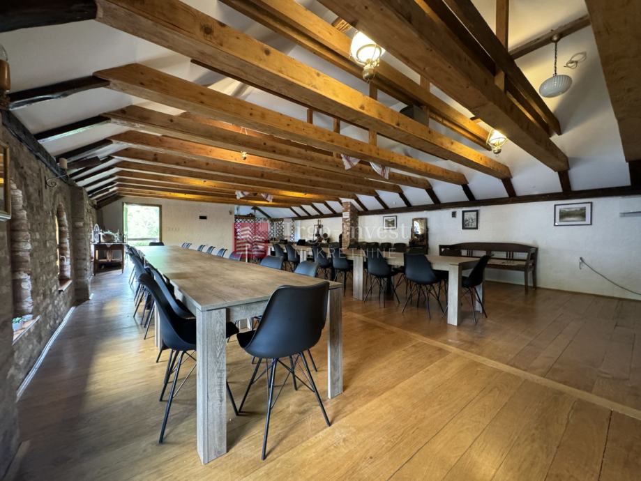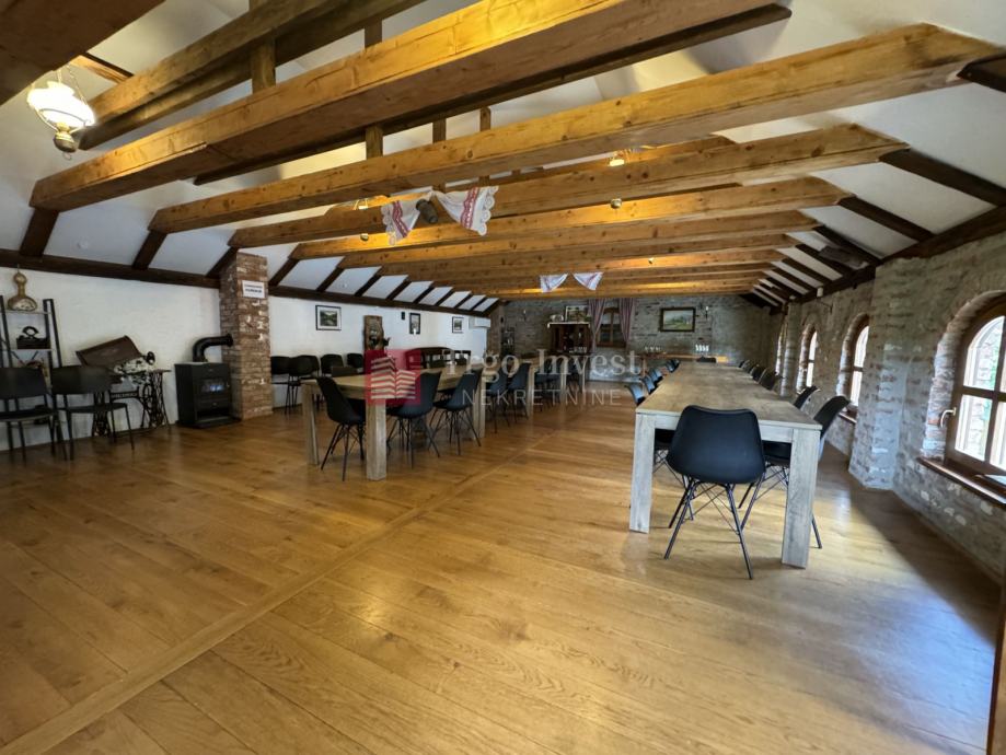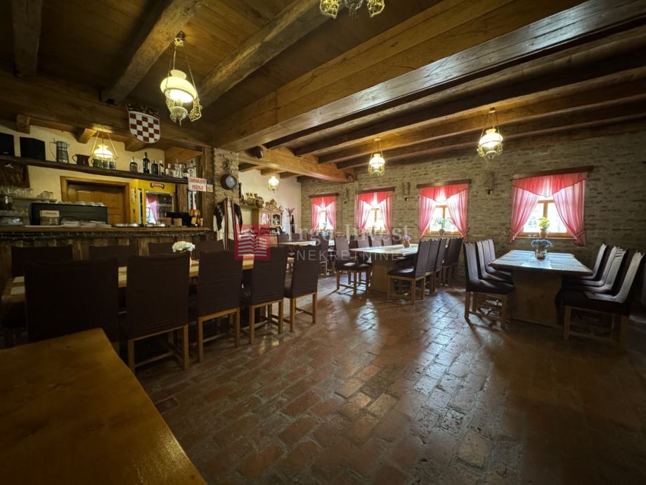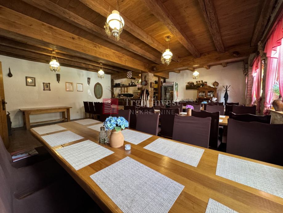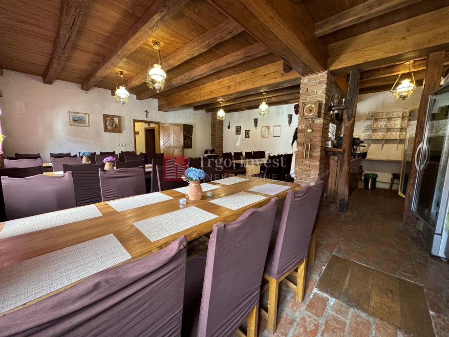 RESTORAN (cca 200 m²): Prizemlje – restoran kapaciteta oko 40 osoba, šank, profesionalna kuhinja s izlazom na dvorište i tri peći, vinoteka (trenutno spremište) s velikim potencijalom, sanitarni čvor (muški/ženski), ostava. Kat – svečana sala za događanja poput krizma, pričesti i manjih svadbi, kapaciteta do 50 osoba. Prostor je klimatiziran.