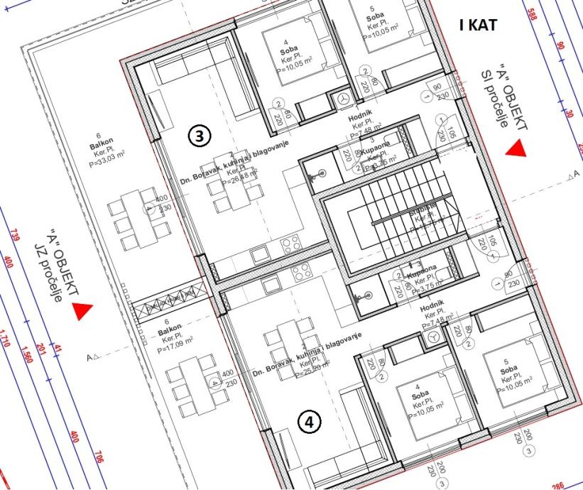 Hodnik 7,48 m2, kupaona 3,75 m2, soba 10,05 m2, soba 10,05 m2, dn. boravak+kuhinja+blagovaona 26,48 m2 i velika terasa površine 33.03 m2 s roštiljem.