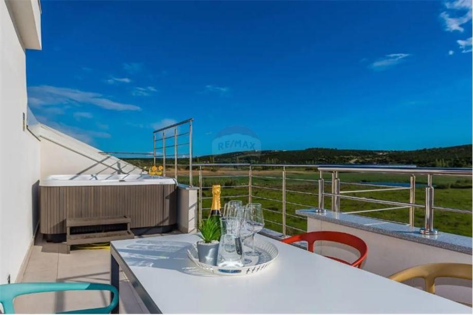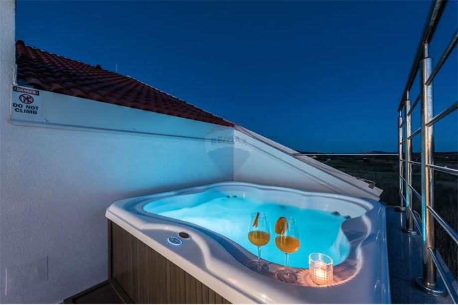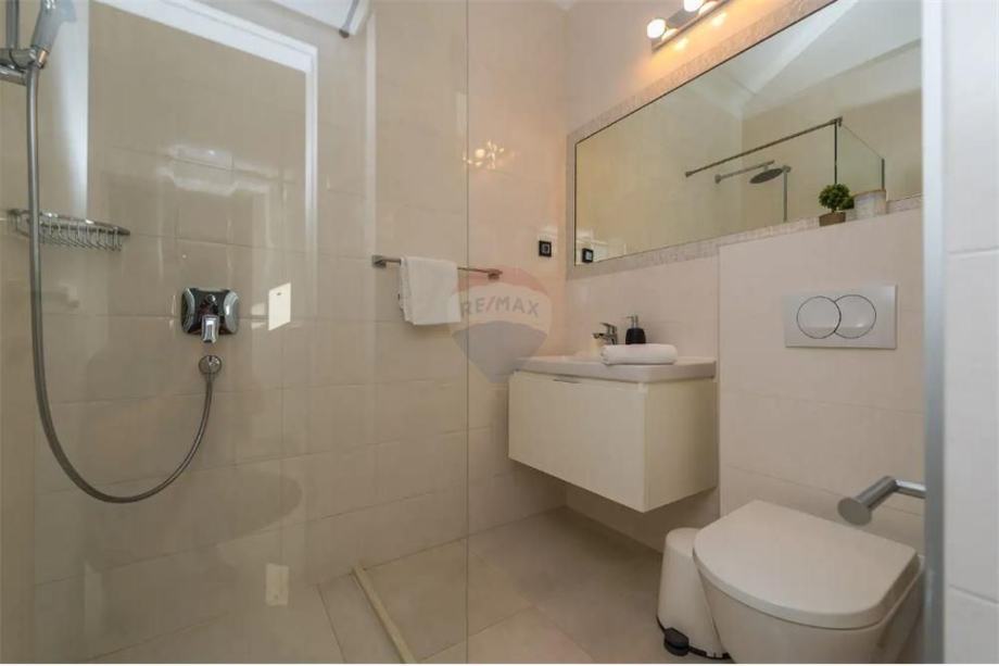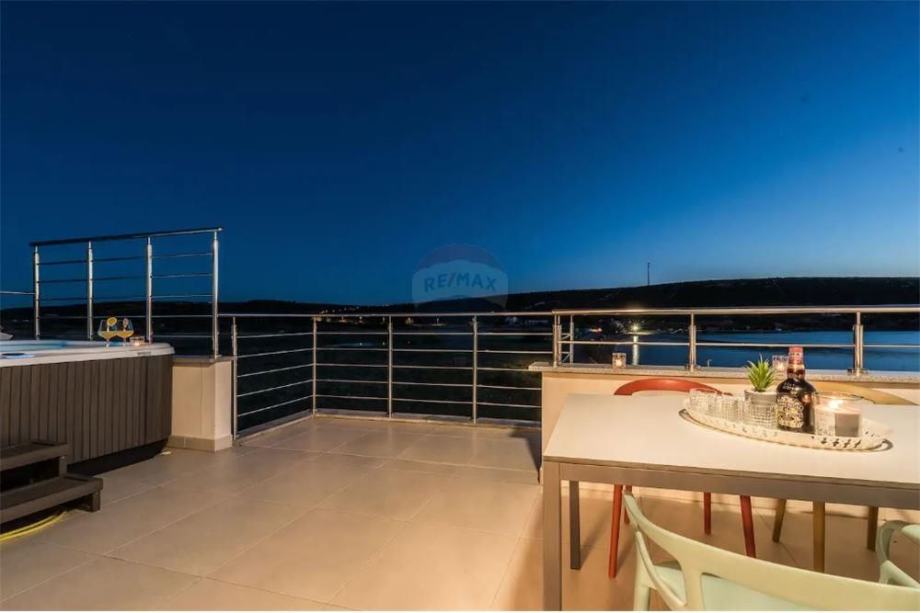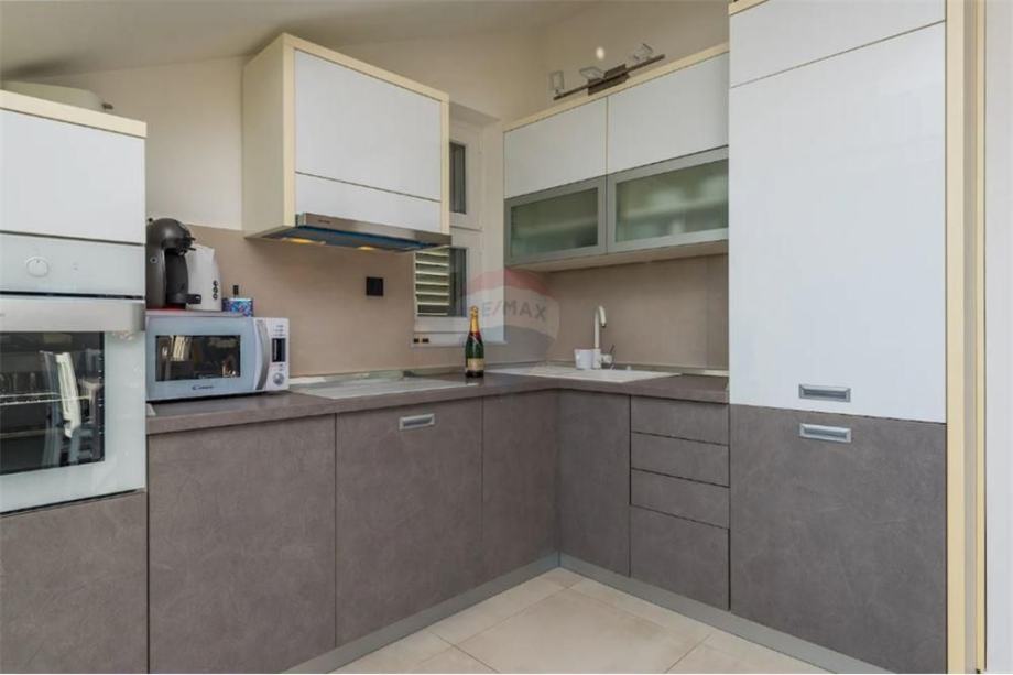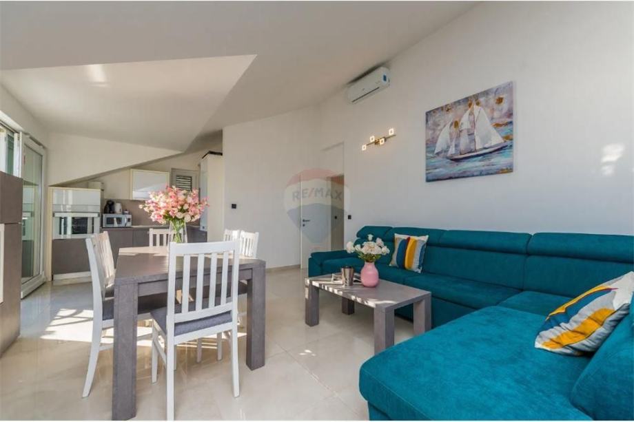 Apartman se prodaje potpuno namješten u odličnom stanju. Prostrana terasa ima prekrasan pogled na more i opremljena je JACUZZIJEM. Trenutno se koristi kao studio apartman, etažno vlasništvo navodi odvojenu spavaću sobu, mogućnost pregradnje. Loggia orjentirana prema sjeveru trenutno se koristi kao spremište, zatvorena u PVC stolariju.