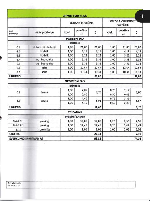 Ukupna brutto korisna površina stana je 98,83 m2, a pripadaju mu dva parkirna mjesta i spremište u suterenu zgrade. Sastoji se od ulaznog hodnika, dvije spavaće sobe, dvije kupaonice, dnevnog boravka/kuhinje/blagovaonice i dvije terase. Sve prostorije imaju podno grijanje te su klimatizirane. Iz dnevnog boravka izlazi se na natkrivenu terasu sa koje su pruža pogled na more, master spavaća soba ima vlastitu terasu i kupaonicu. Aluminijske rolete na svim otvorima sa elektropodizačima, vrhunski parket na podovima.