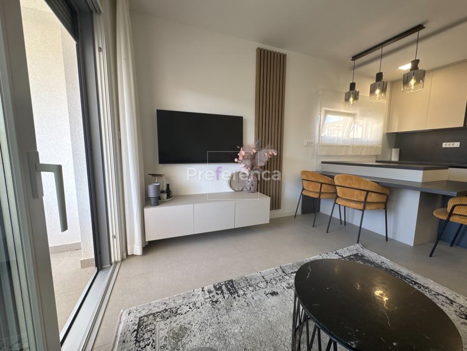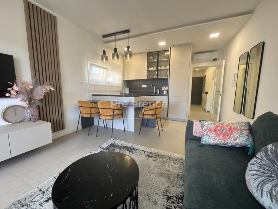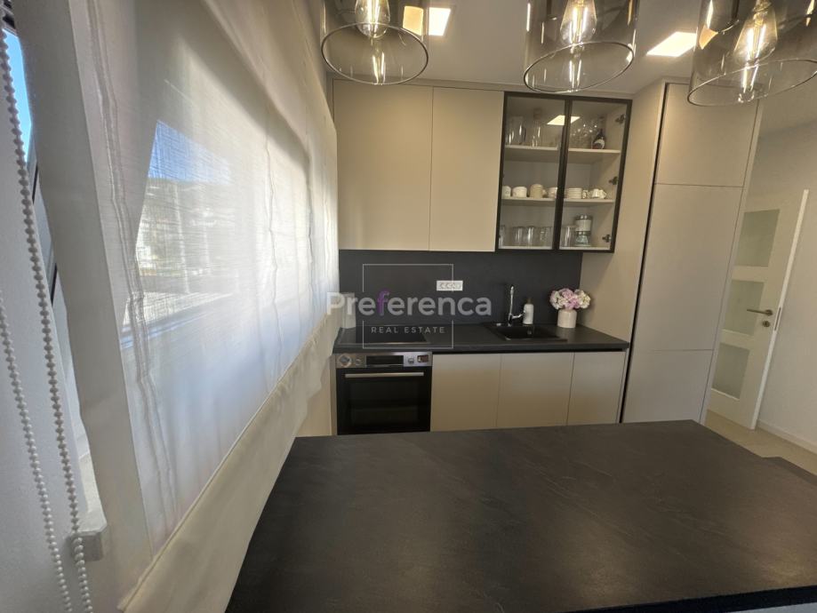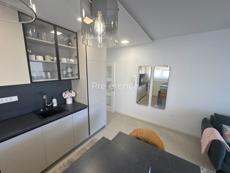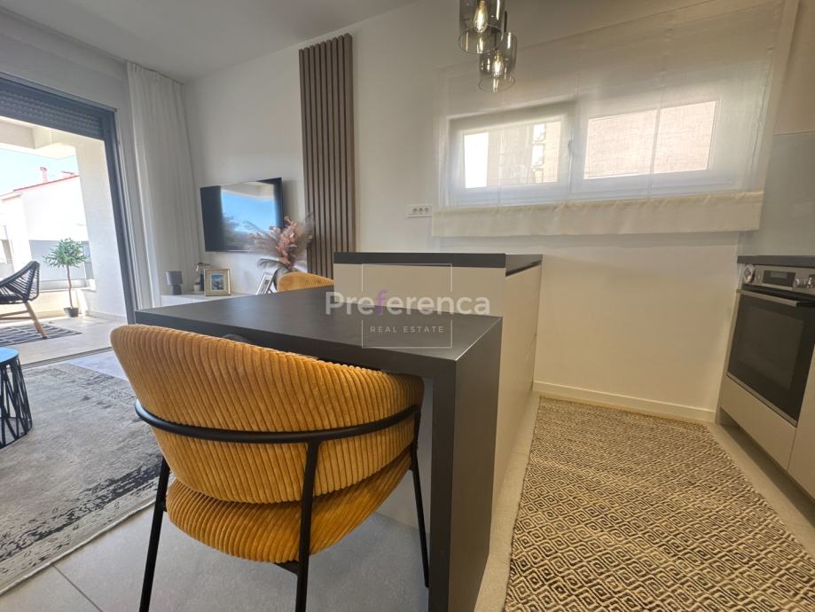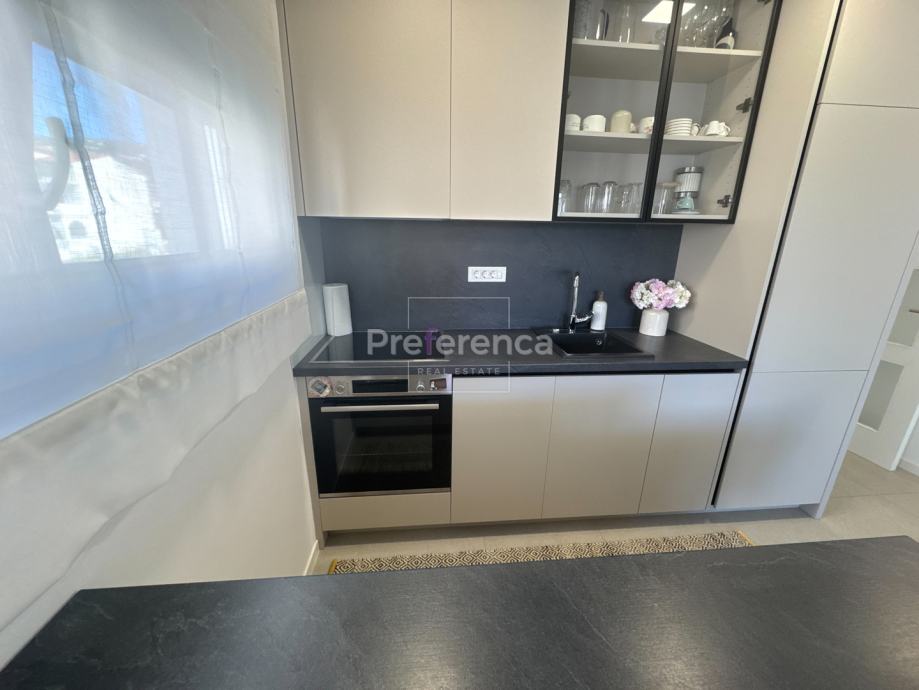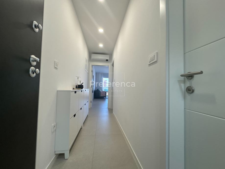 Iz dnevnog boravka izlazi se na natkrivenu terasu sa koje su pruža pogled na more, master spavaća soba ima vlastitu terasu i kupaonicu. Aluminijske rolete na svim otvorima sa elektropodizačima, vrhunski parket na podovima. Zgrada se nalazi u drugom redu do mora, privatan pristup do plaže omogućen svim stanarima zgrade.