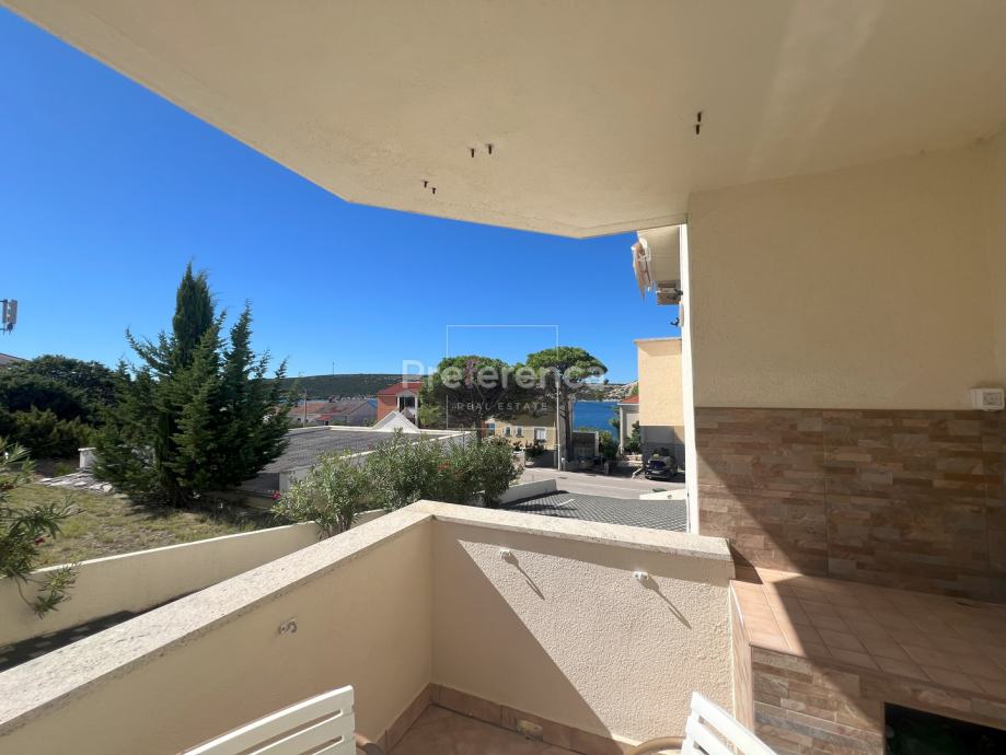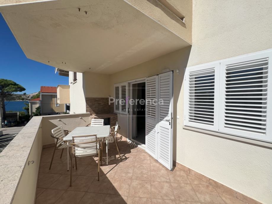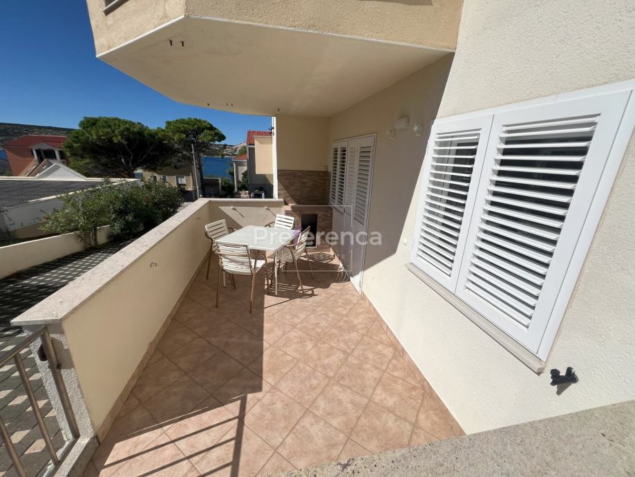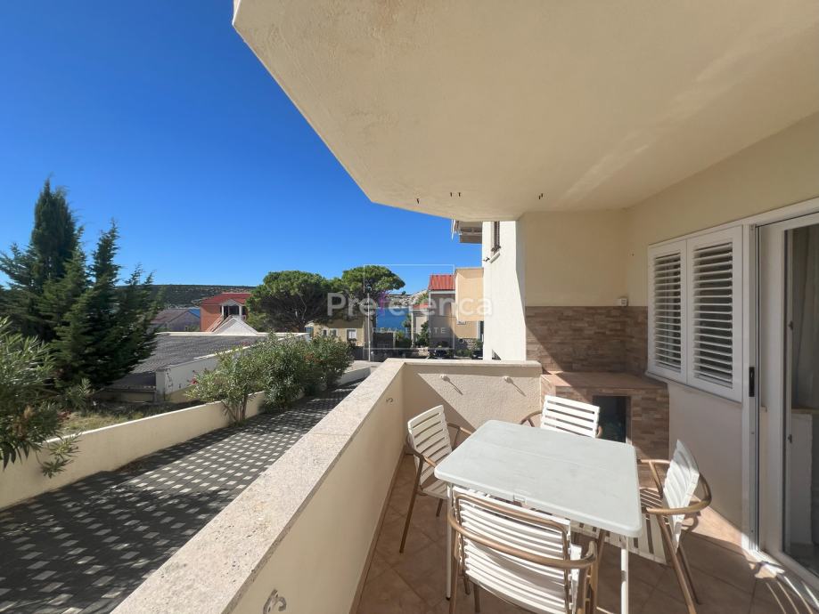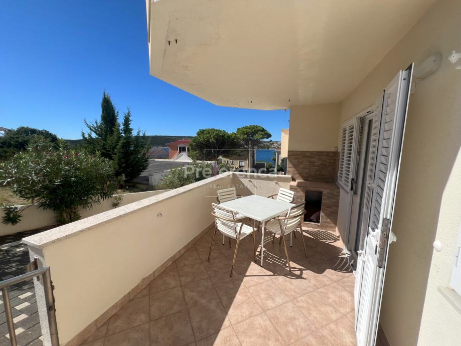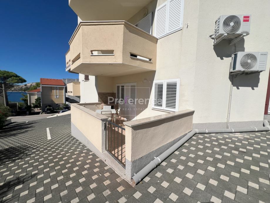 Natkrivena terasa ima pogled na more, ograđena je od dvorišta te opremljena tendom koja pruža potpunu privatnost. Vanjska stolarija promjenjena 2023 godine, instalirana vrhunska aluminijska stolarija idealna za paško podneblj. Stan dolazi s osiguranim parkiralištem. Za grijanje i hlađenje, stan je opremljen klima uređajem, što osigurava ugodnu temperaturu tijekom cijele godine.