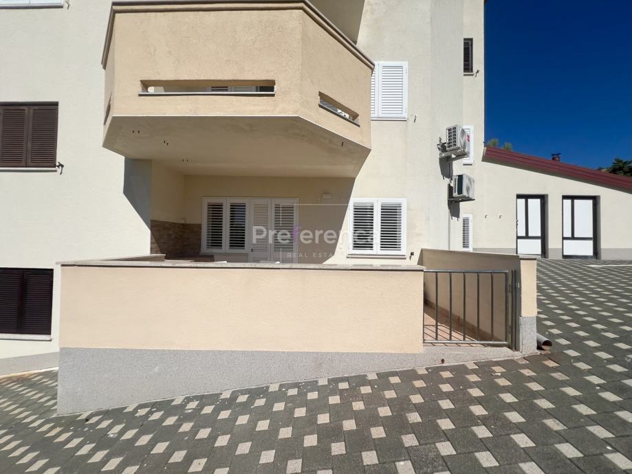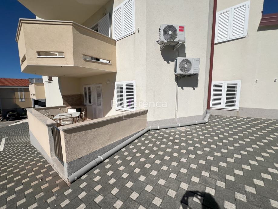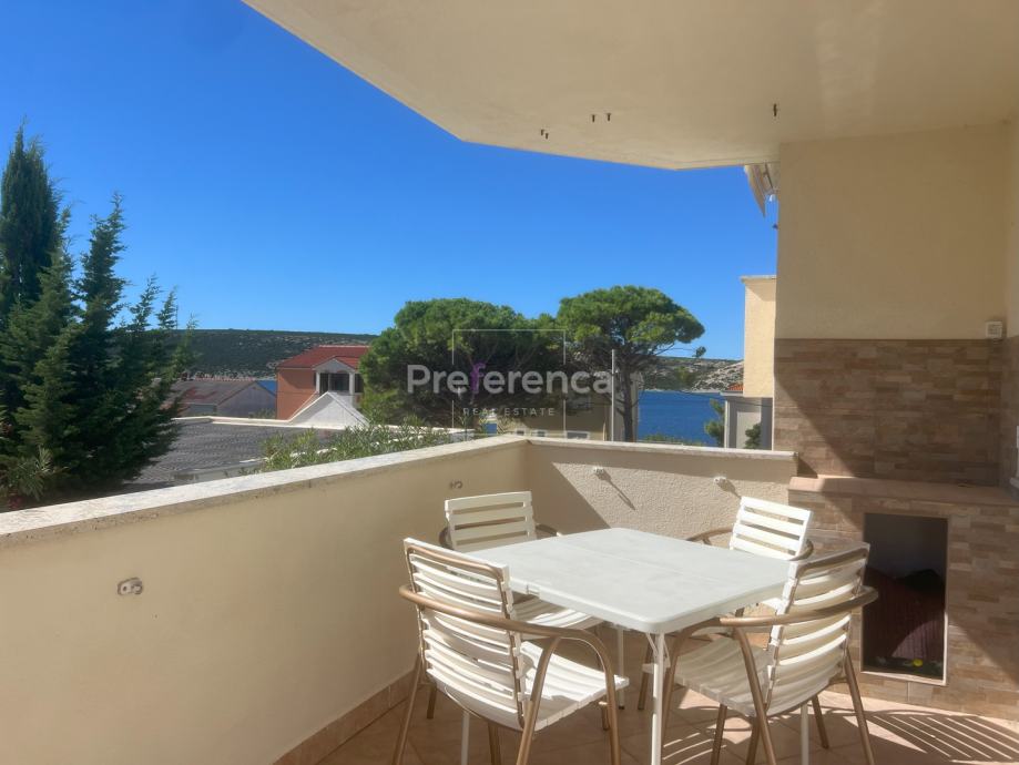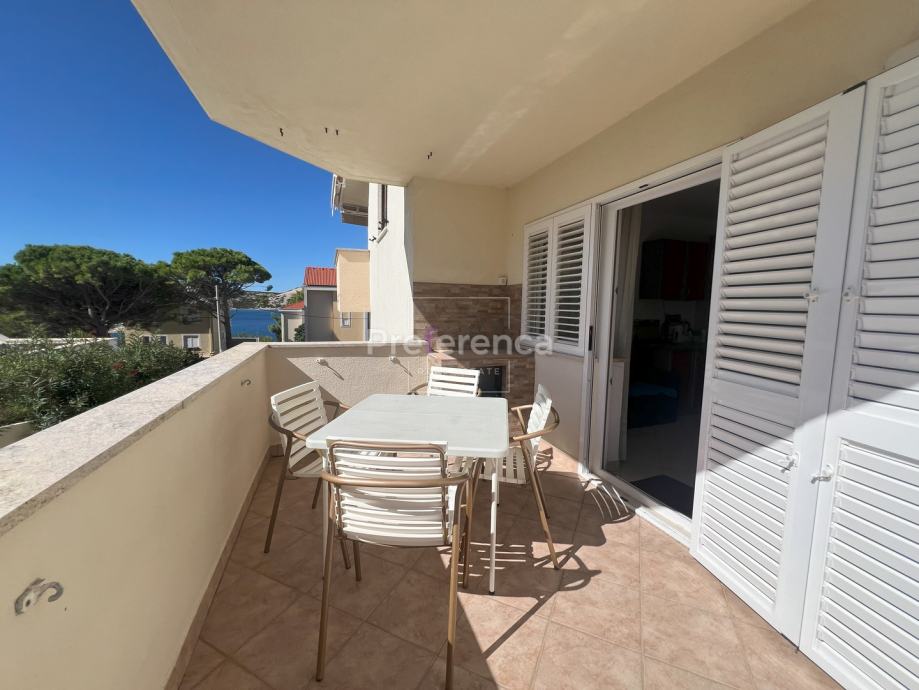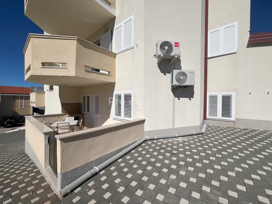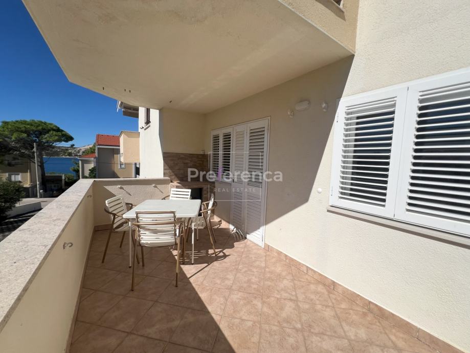 Natkrivena terasa ima pogled na more, ograđena je od dvorišta te opremljena tendom koja pruža potpunu privatnost. Vanjska stolarija promjenjena 2023 godine, instalirana vrhunska aluminijska stolarija idealna za paško podneblj. Stan dolazi s osiguranim parkiralištem. Za grijanje i hlađenje, stan je opremljen klima uređajem, što osigurava ugodnu temperaturu tijekom cijele godine.