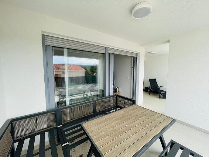 Prodaje se luksuzno namješteni trosobni apartman ukupne površine 118,53 m2 s tri terase na I katu nove zgrade u Staroj Novalji.
