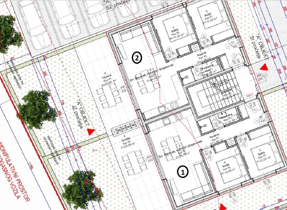 Hodnik 7,48 m2, kupaona 3,59 m2, soba 10,05 m2, soba 10,05 m2, dn. boravak+kuhinja+blagovaona 25,19 m2 i terasa 20,86 m2 s roštiljem.