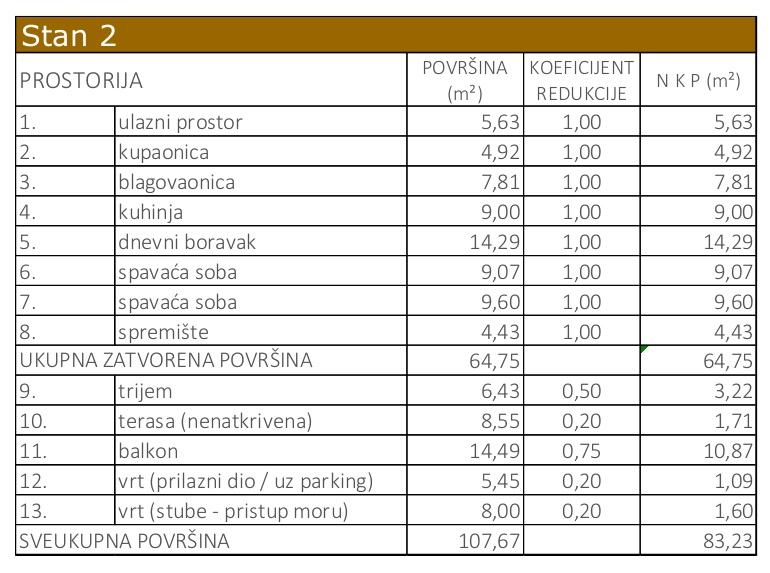 Prodaje se trosobni apartman ukupne površine 107,67 m2, obračunski 83,23 m2 na I katu novogradnje na atraktivnoj lokaciji, gotovo uz samo more u Staroj Novalji.