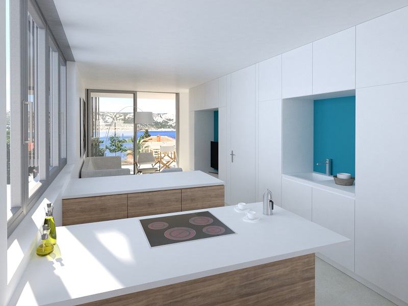 Apartman se sastoji od ulaznog prostora, kupaonice, dnevnog boravka, kuhinje, blagovaonice, 2 spavaće sobe, spremišta, trijema i terasa površine 8,55 m2 s otvorenim pogledom na more.