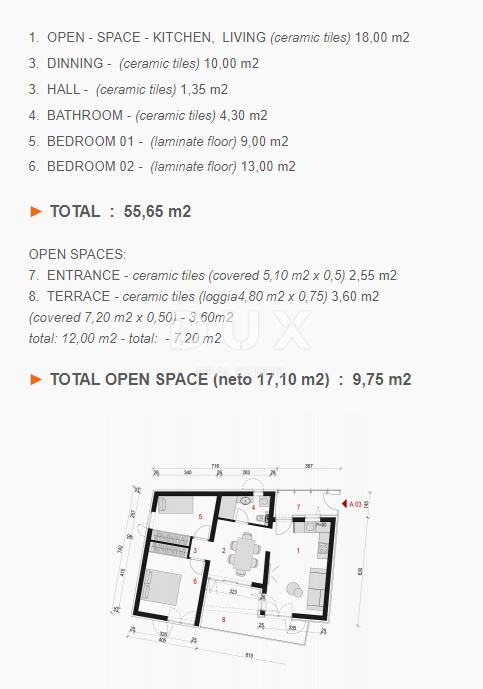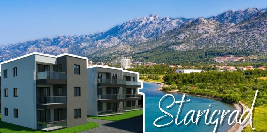 Predstavljamo vam izuzetnu priliku da postanete vlasnik novoizgrađenog stana u Starigradu pored Zadra. Stan se sastoji od dnevnog boravka s kuhinjom i blagovaonicom, kupatila, dvije spavaće sobe, terase i jednog parkirnog mjesta. Svaki apartman ima zaseban ulaz i terasu orijentiranu prema moru. Zgrada je pozicionirana na odličnoj lokaciji, uz turistički sadržaj i sportske terene, ima odličnu prometnu povezanost a najvažnija informacija vezana za makro lokaciju je da su predmetni objekti udaljeni 2 km od Nacionalnog parka ''Paklenica'', a da su u neposrednoj blizini i nacionalni parkovi: Sjeverni Velebit, Kornati i Krka. Za sve ljubitelje prirode i aktivnog odmora ovo je idealno mjesto kao spoj ''plave'' (morske), ''bijele'' (planinske) i ''zelene'' (šumske) Hrvatske.