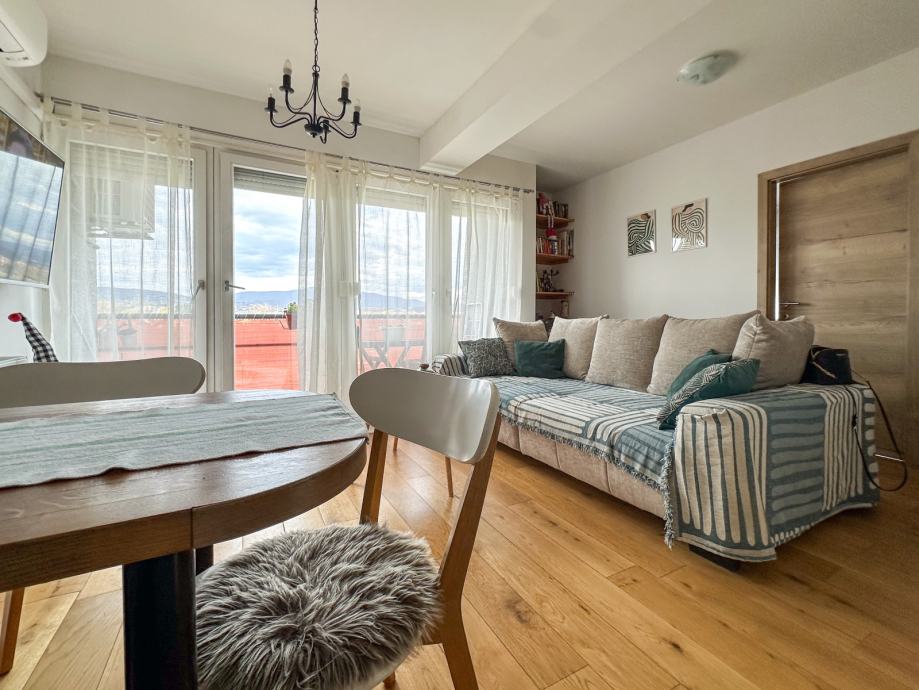 Opremljen je etažnim plinskim centralnim grijanjem, klimom, protuprovalnim vratima te podnim grijanjem u kupaonici. Korišteni su kvalitetni materijali, uključujući hrastov seljački pod i talijansku keramiku, što dodatno doprinosi ukupnom dojmu prostora.