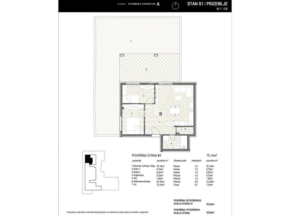 Stan A1 trosoban, nalazi se u prizemlju i sastoji se od: hodnika, kupaonice, wc-a, dnevnog boravka sa kuhinjom i blagovaonicom, dvije sobe, natkrivene terase i vrta. Ukupna prodajna površina je 75,14 m2.