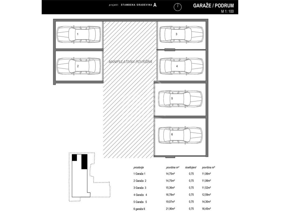 U podrumu su garažna parkirna mjesta i spremišta, u prizemlju su vanjska parkirna mjesta.