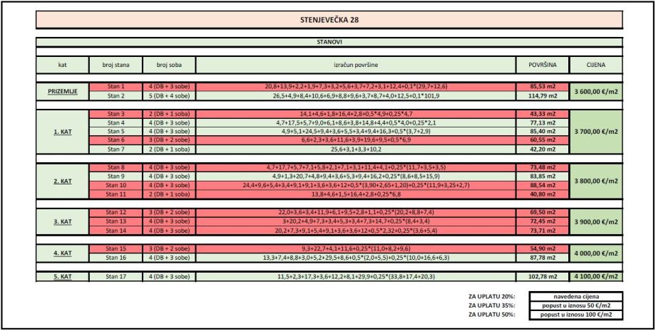Stenjevec, Stenjevečka 28, Zagreb, 100 metara od rotora na ulici Ivane Brlić Mažuranić - novi stambeni projekat od sedamnaest stanova s pripadajućim garažnim parkirnim mjestima i spremištima. Početak izgradnje travanj 2025g. Završetak listopad 2026. godine. Zgrada se gradi prema svim općenito kvalitetnim, protupotresnim, ekološkim i nisko energetskim uvjetima, renomiranim materijalima i opremom kako bi svaka obitelj u zgradi imala sve privilegije življenja u ovom impresivnom, bogatom, spontanom i suncem okupanom projektu.