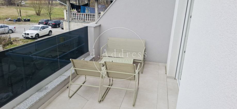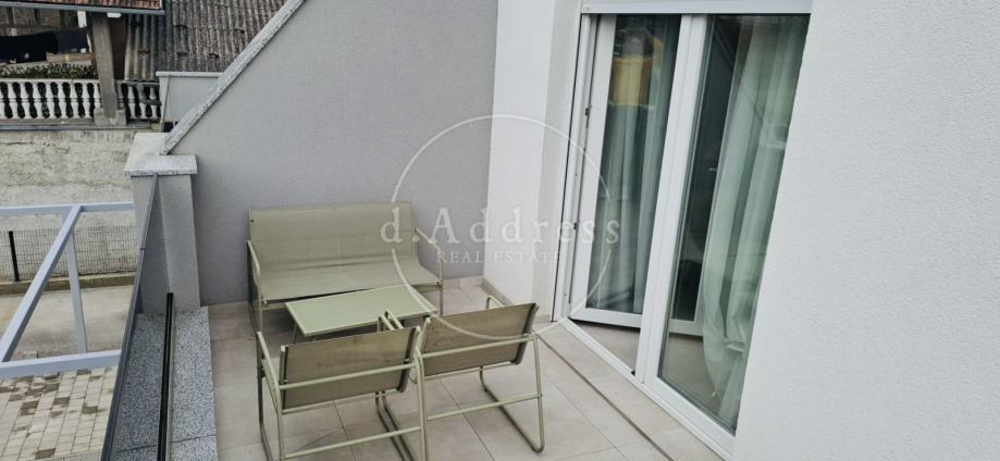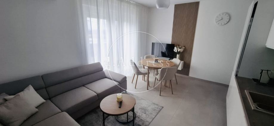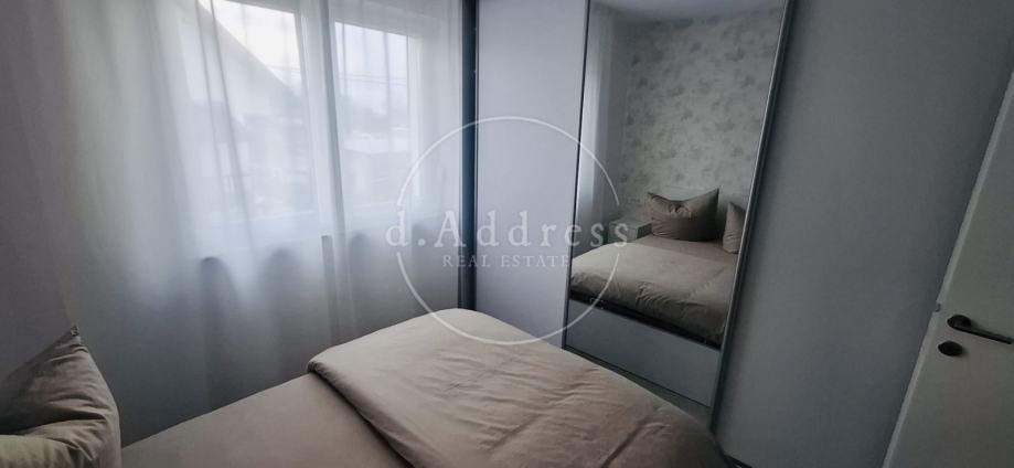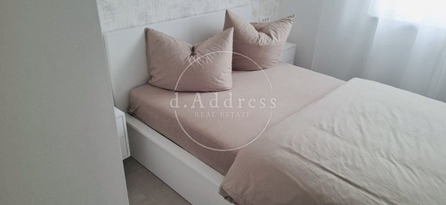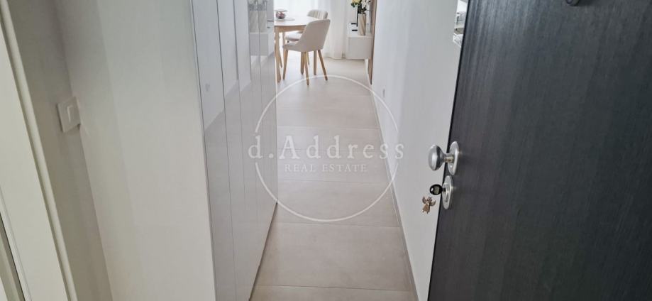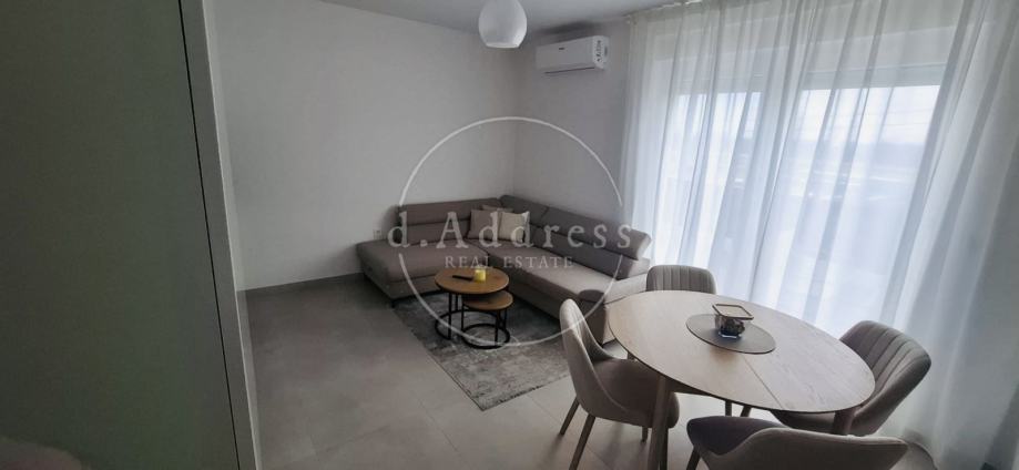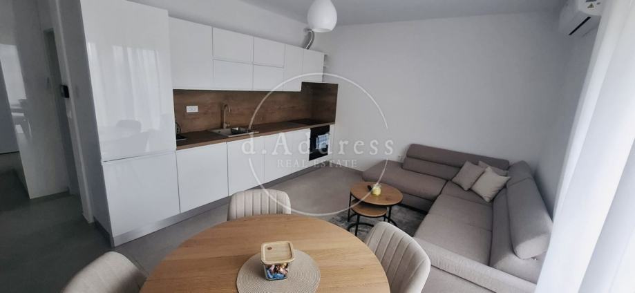 Posredujemo u najmu moderno uređenog i potpuno opremljenog dvosobnog stana na 1. katu novogradnje koji se sastoji od ulaza (hodnika), dnevnog boravka, blagovaonice i kuhinje, sobe i kupaonice ukupne površine 38,76 m2 s balkonom površine 9,71 m2, a pripada mu i parkirno mjesto oznake PM8 površine 12,50 m2.