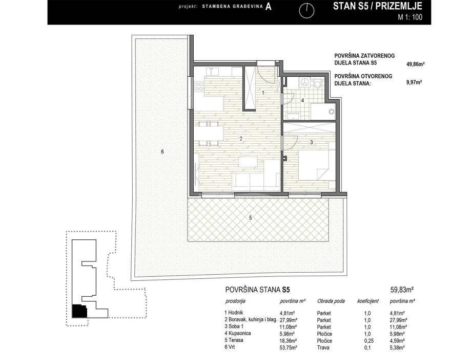 Stan A6 dvosoban, nalazi se u prizemlju i sastoji se od: hodnika, kupaonice, dnevnog boravka sa kuhinjom i blagovaonicom, sobe, spremišta i balkona. Ukupna prodajna površina je 56,54 m2.