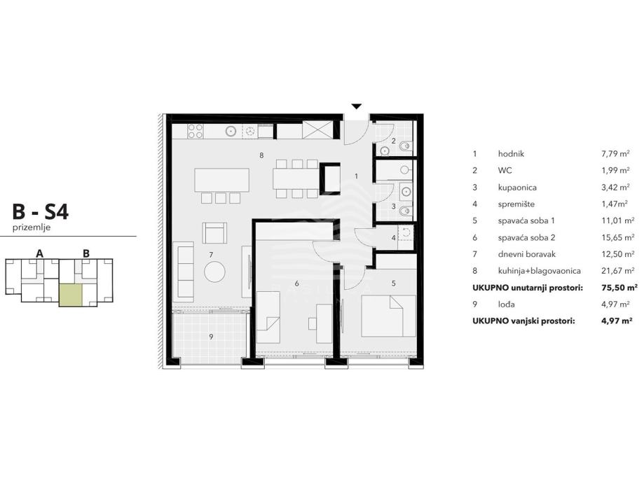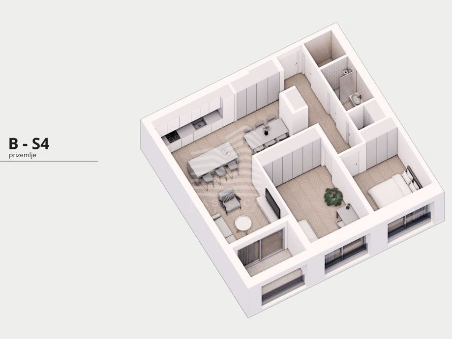 Stan B04 troban, nalazi se u prizemlju i sastoji se od hodnika, wc-a, kupaonice, 2 sobe, kuhinje sa blagovaonicom, dnevnog boravka i loggie. Ukupne površine 79,23 m2.