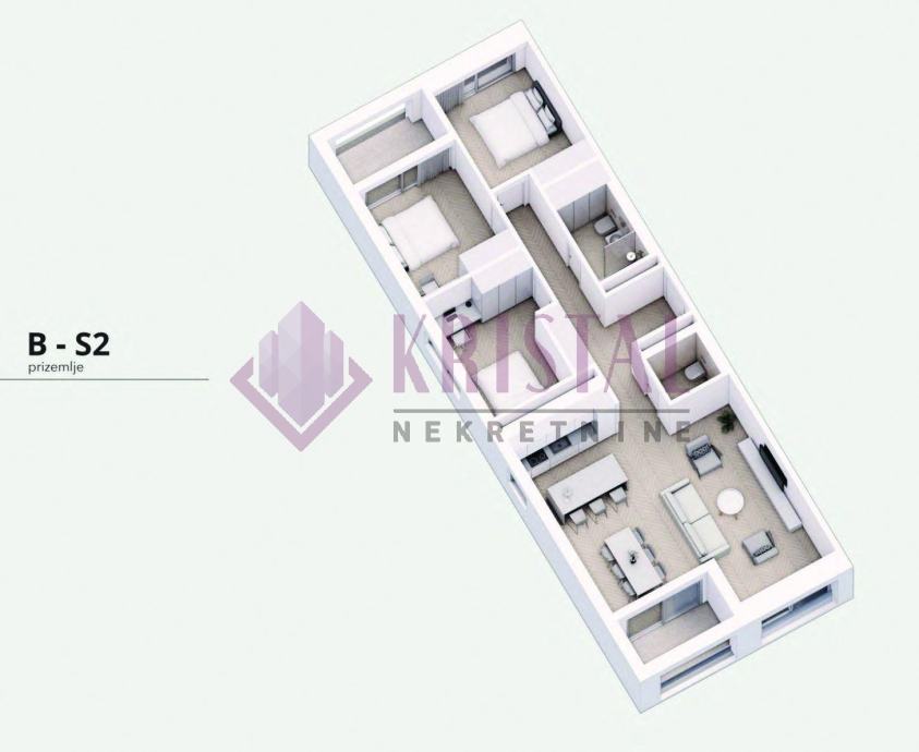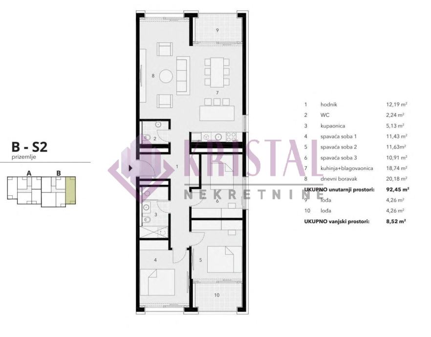 4-SOBAN STAN oznake B-S2 stambene površine 92.45 m2, nalazi se u prizemlju, sastoji se od ulaz/hodnik, kupaonica, wc, soba 1, soba 2, soba 3, dnevni boravak, blagovaona + kuhinja, loggia 1 4.26 m2 (neto 3.19 m2), loggia 2 4.26 m2 (neto 3.19 m2).