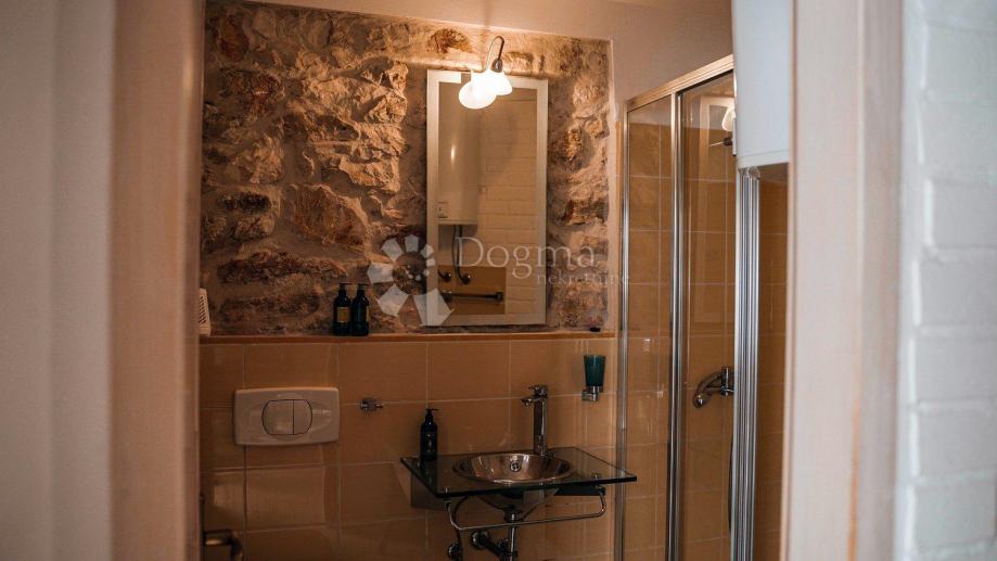Prostrana kuhinja s blagovaonicom, savršena za obiteljska okupljanja, te ugodan dnevni boravak. Kupaonica s WC-om ima modernu keramiku na podu. Iz prizemlja se izlazi na ograđenu terasu od autohtonog kamena, opremljenu s ljetnom kuhinjom i električnim roštiljem, a pod terase je obložen starim ciglama betoniranim u beton.