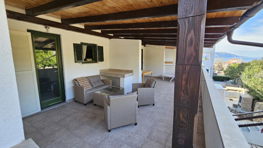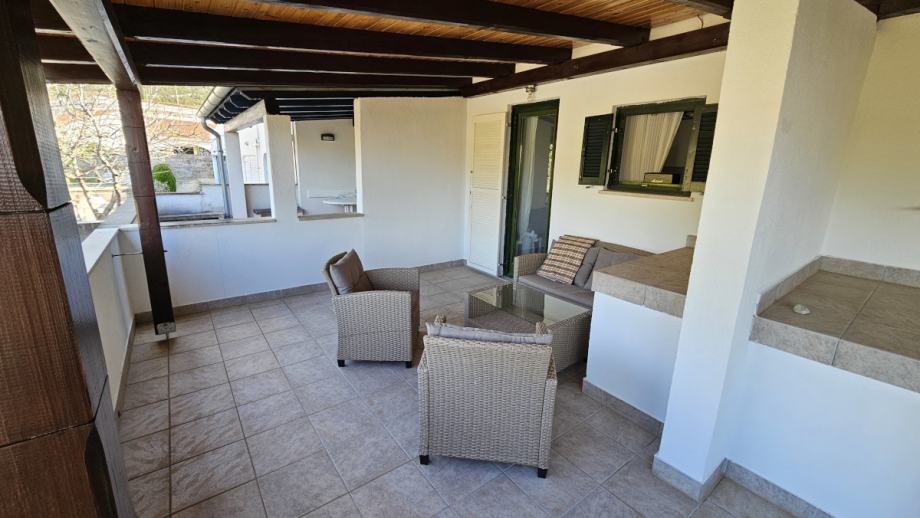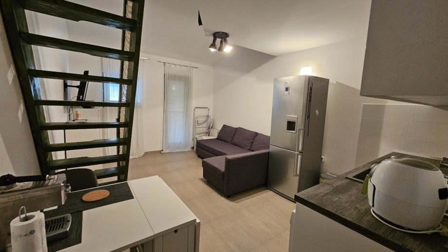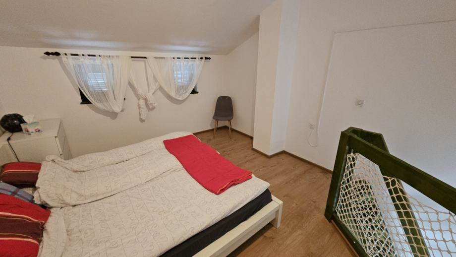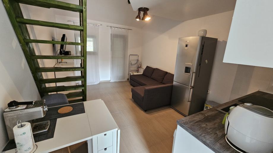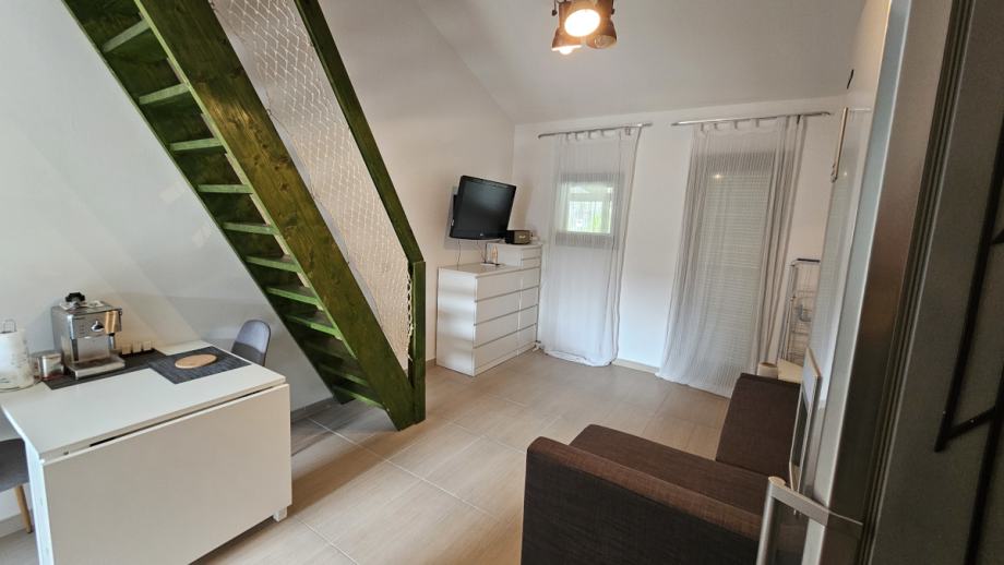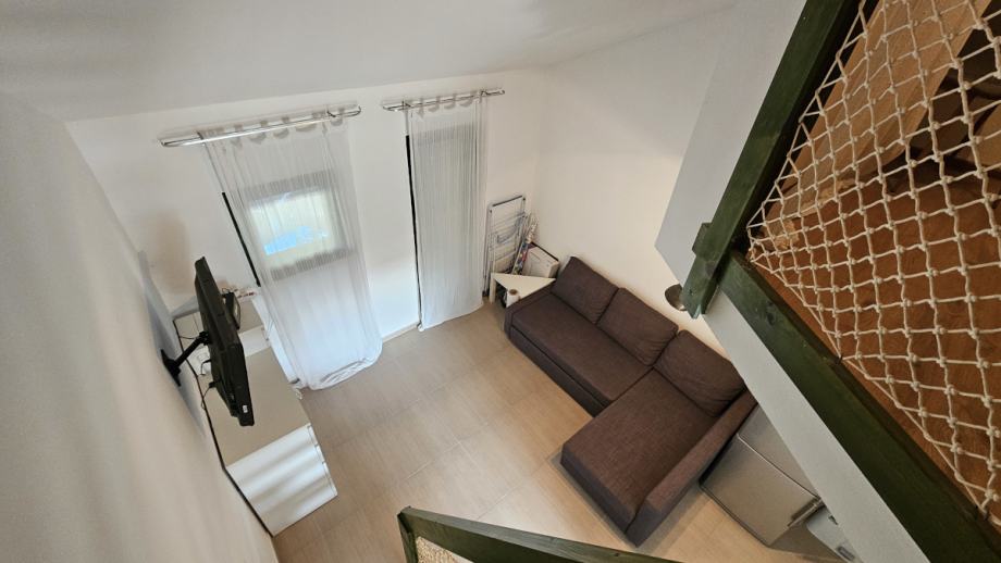 Apartman je otvorenog tipa, prizemlje je dnevni boravak, kuhinja i blagovaona u jednom, sa zasebnom kupaonicom, a mansarda je izvedena kao spavaonica. Apartman ima i veliku terasu cca.15m2 koja je u potpunosti natkrivena i popločena keramičkim pločicama. Ispred ulaznih vrata u apartman je nadstrešnica koja štiti od sunca i kiše.