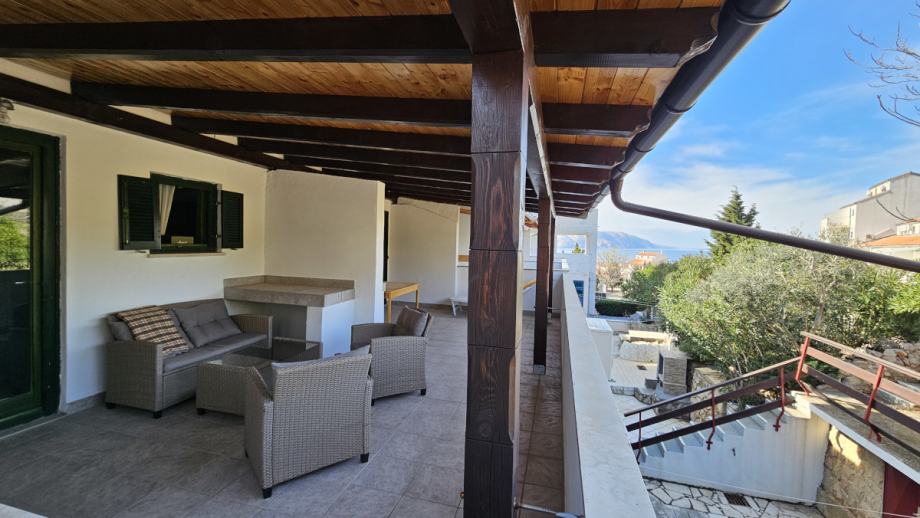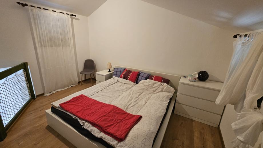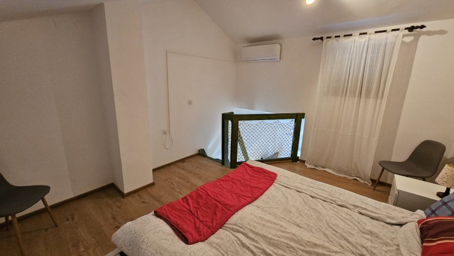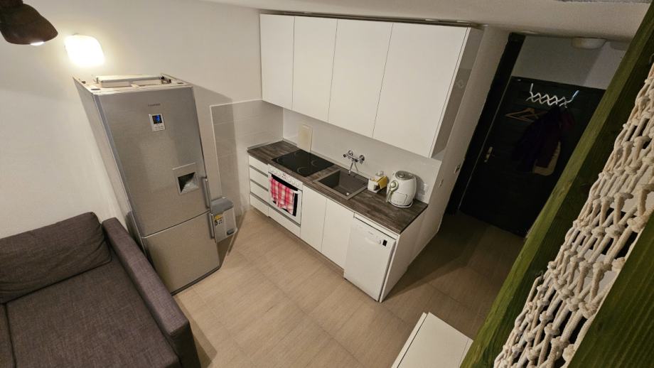 Apartman je u potpunosti novo namješten, nova kuhinja izrađena po mjeri sa staklokeramičkom pločom, pećnicom, granitnim sudoperom i perilicom posuđa. Veliki hladnjak sa zamrzivačem je isto dio kuhinje. Kutna garnitura na razvlačenje je u dnevnom boravku, a na galeriji je bračni krevet 2 x 2m kao i klima uređaj s kojim se može hladiti i grijati cijeli apartman. U kupaonici su WC školjka i tuš kabina, te priprema za perilicu rublja. Na podu prizemlja su novo postavljene keramičke pločice, a na galeriji laminat.