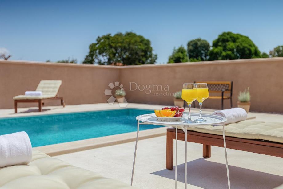 Očaravajuća okućnica ove kuće održavana je s ljubavlju i pažnjom. Uz parking za dva automobila, imate i dovoljno prostora za igru ili odmor na zelenim površinama. Bazen veličine 6x3m s sunčalištem pruža osvježenje i užitak tijekom toplih ljetnih dana. Uz bazen se nalazi "chill zona" s lijepo uređenom konobom koju krasi kamin, savršena za opuštanje i druženje s obitelji i prijateljima.