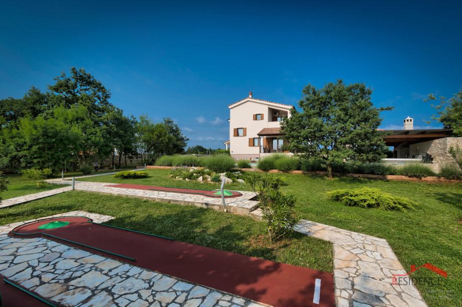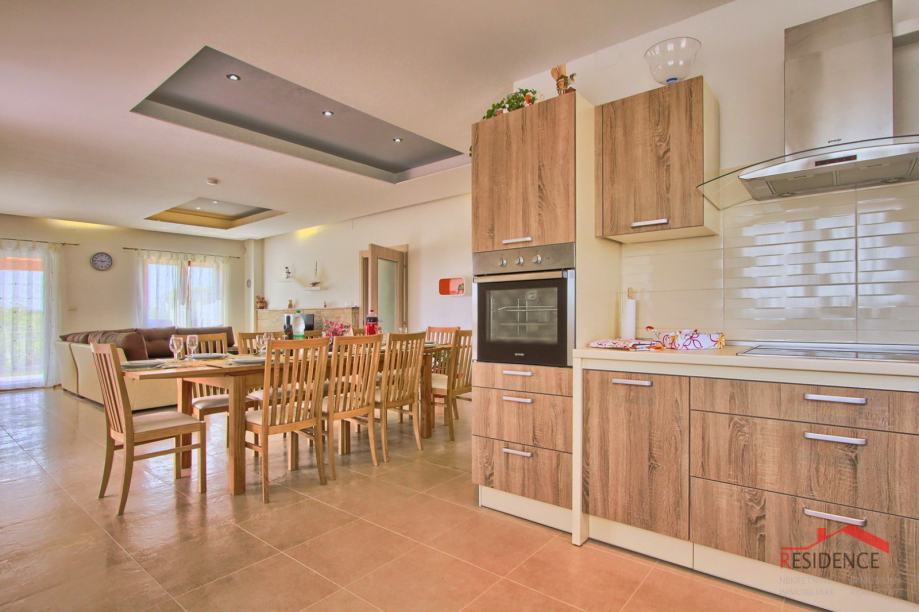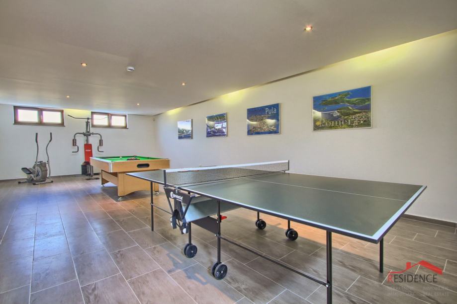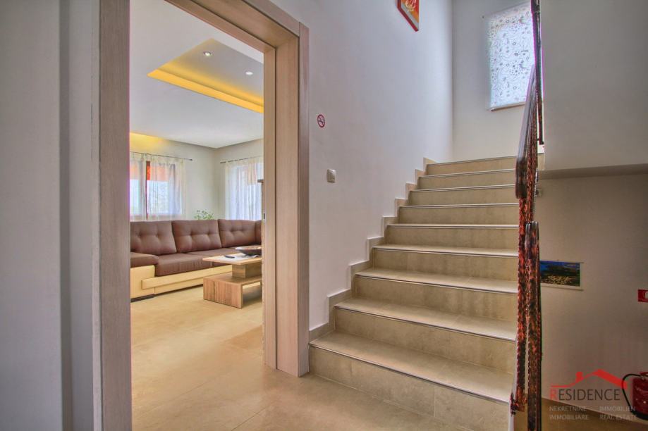 U podrumu se nalazi multifunkcionalni prostor (fitness i druge sportske aktivnosti), kotlovnica i ostava; U prizemlju se nalazi predprostor, kupatilo, dnevni boravak sa kuhinjom i blagavaonicom te 1 klimatizirana spavaća soba sa vlastitim predprostorom i kupatilom.Iz dnevnog boravka se izlazi na natkrivenu terasu površine 36 m2, do bazena i kamina. Na prvom katu su 3 klimatizirane spavaće sobe svaka sa vlastitim predprostorom i kupatilom od kojih jedna ima izlaz na balkon i pogled na more u daljini.