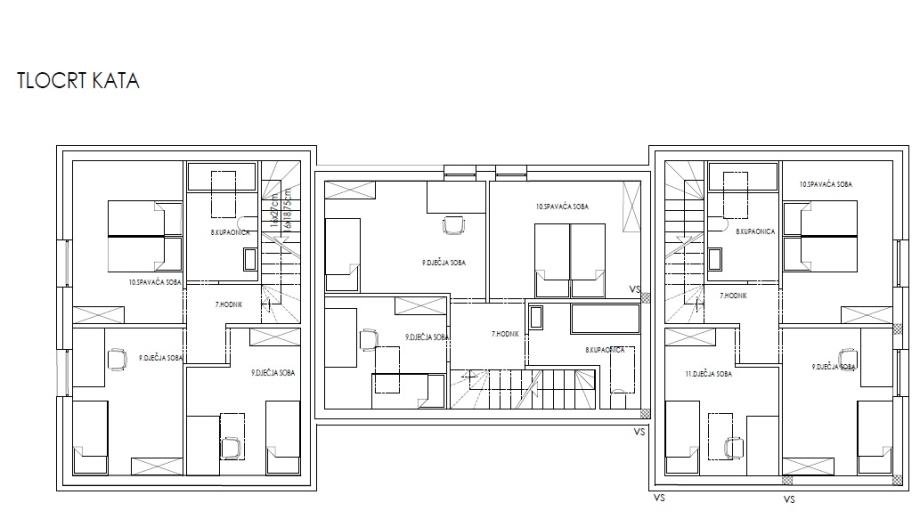 Na katu se nalazi: hodnik, kupaonica, dvije dječje sobe, spavaća soba.
