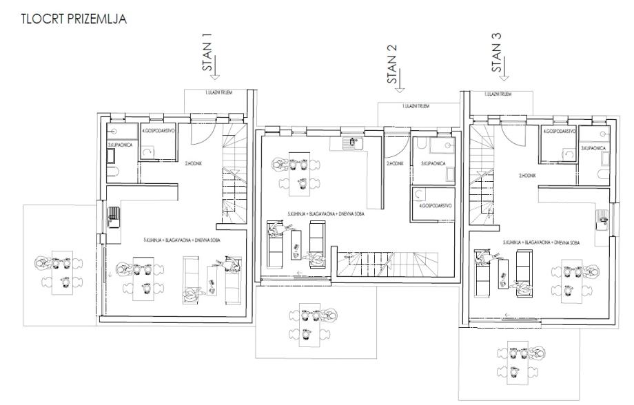 U prizemlju kuće se nalazi: ulazni trijem, hodnik, kupaonica, gospodarstvo, kuhinja, dnevni boravak, blagovaona i terasa.