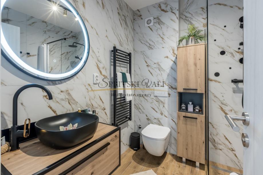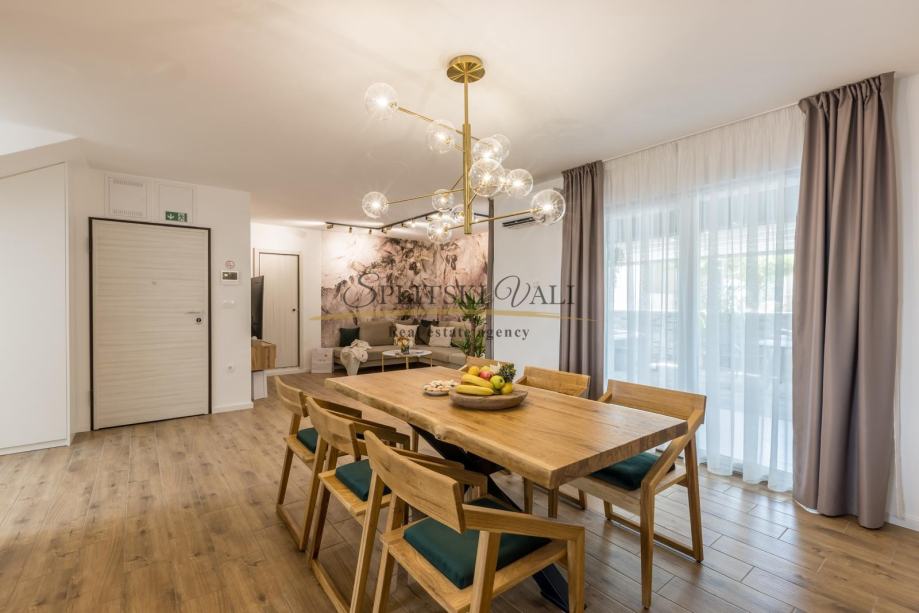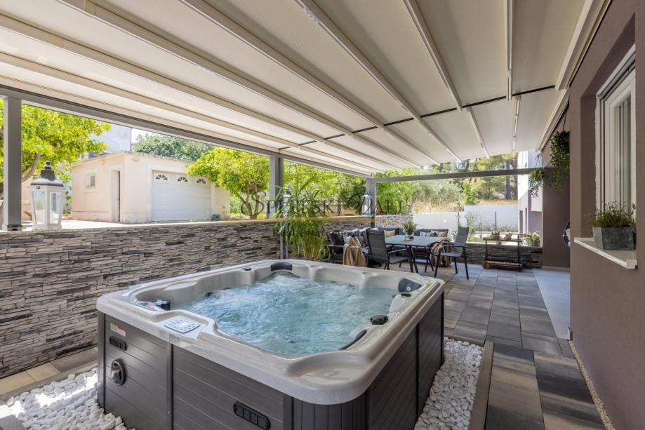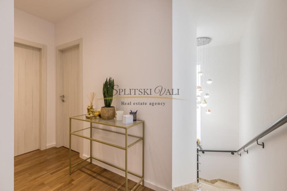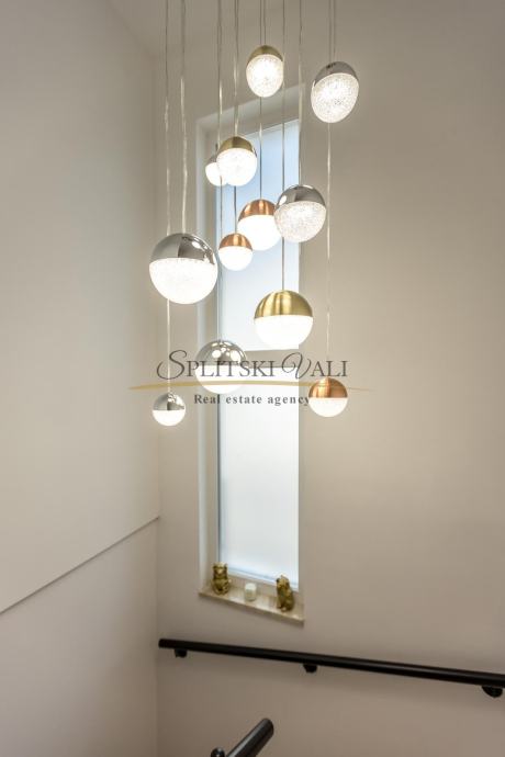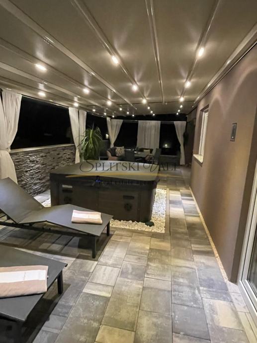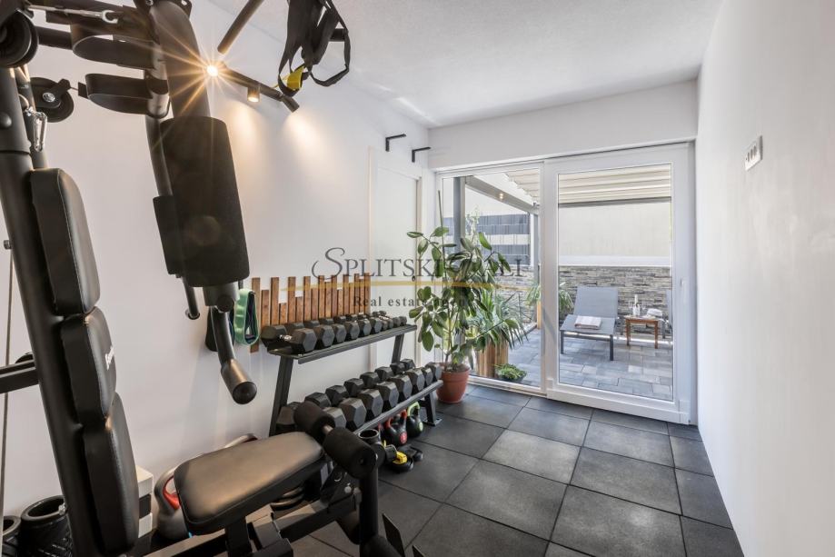 U prizemlju je smješten prostrani dnevni boravak, moderna kuhinja s blagovaonicom, wc, teretana, natkrivena lođa te izlaz u uređeno privatno dvorište s jacuzzijem.