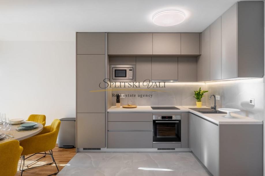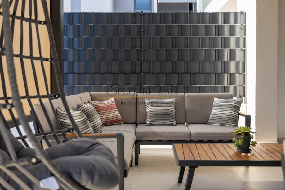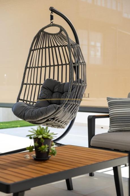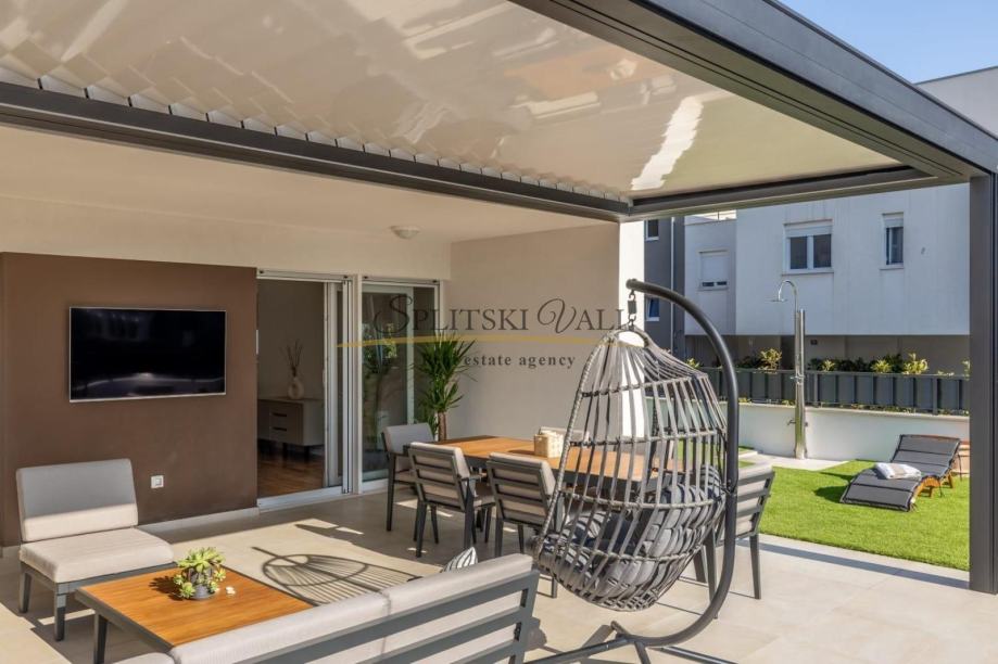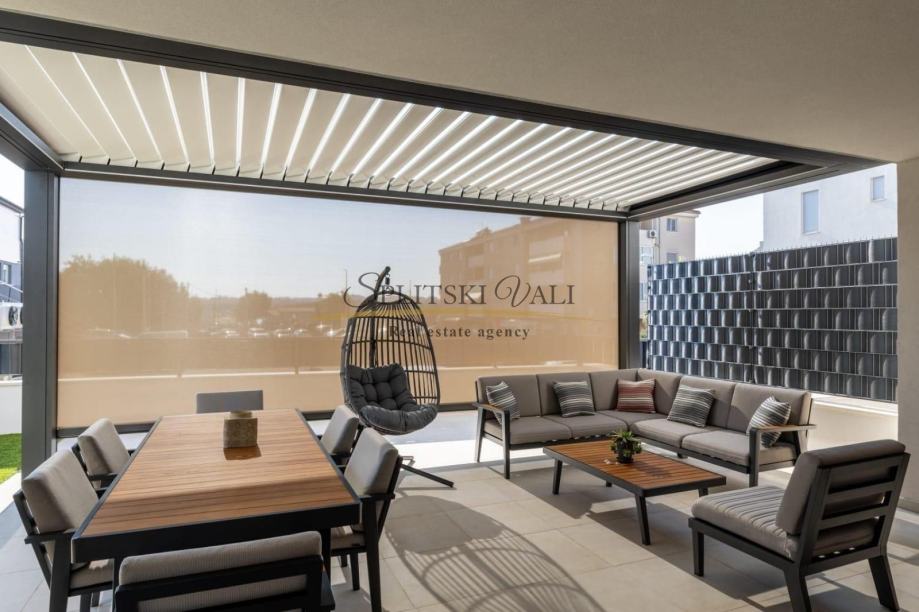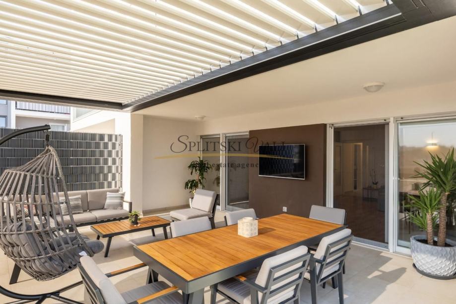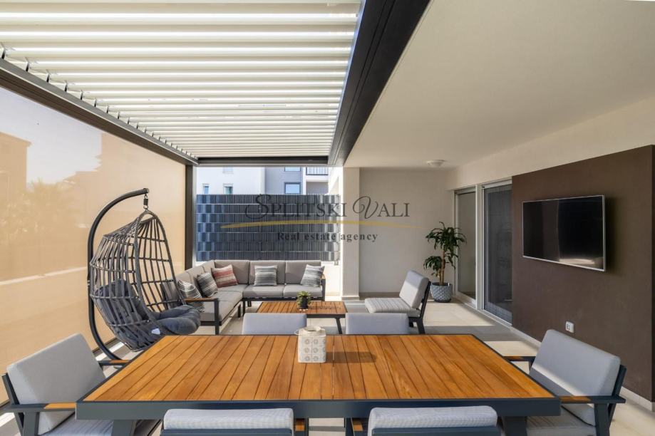 Stan se sastoji od tri spavaće sobe, dva kupatila, kuhinje s blagovaonicom, ostave, natkrivene terase .