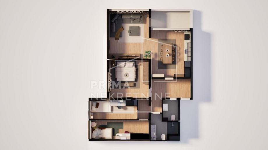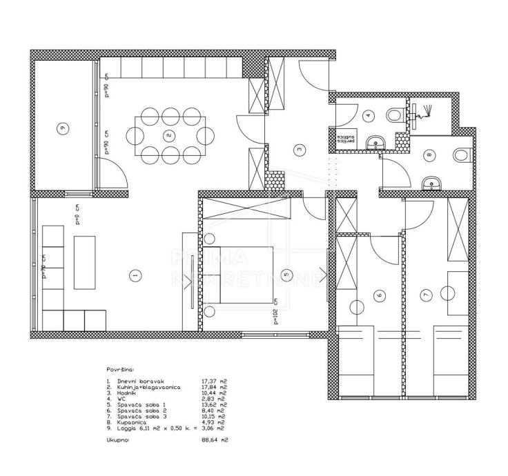 Stan se sastoji od ulaznog hodnika (10,44 m2), dnevnog boravka (17,37 m2), kuhinje i blagavaonice (17,84 m2), sobe 1 (13,62 m2), sobe 2 (8,40 m2), sobe 3 (10,15 m2), kupaonice (4,93 m2), WC-a (2,83 m2) i balkon/loggia (6,11 m2).