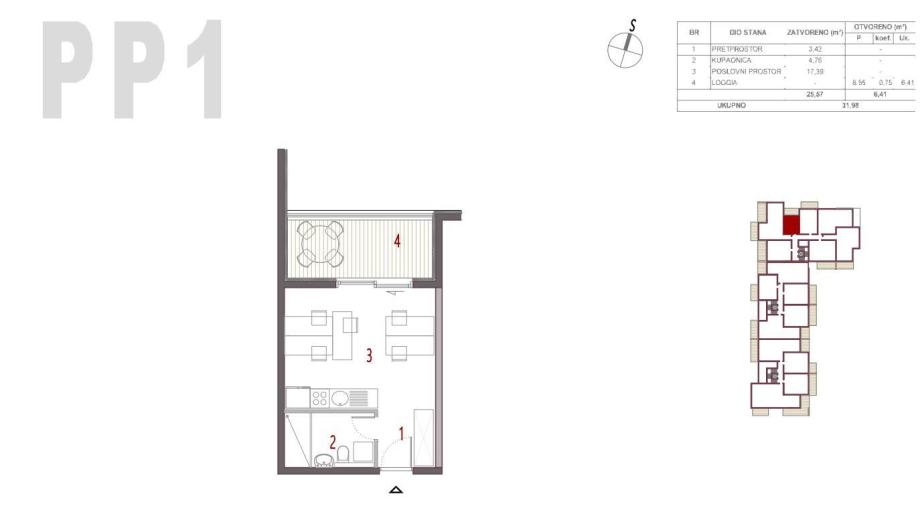 PP1- prvi kat, poslovni prostor, sastoji od predprostora, poslovnog dijela prostora, kupaonice, površine 25.39 m2, s lođom površine 8.55 m2, kojem pripada parkirališno mjesto u dvorištu površine 12,50 m2.