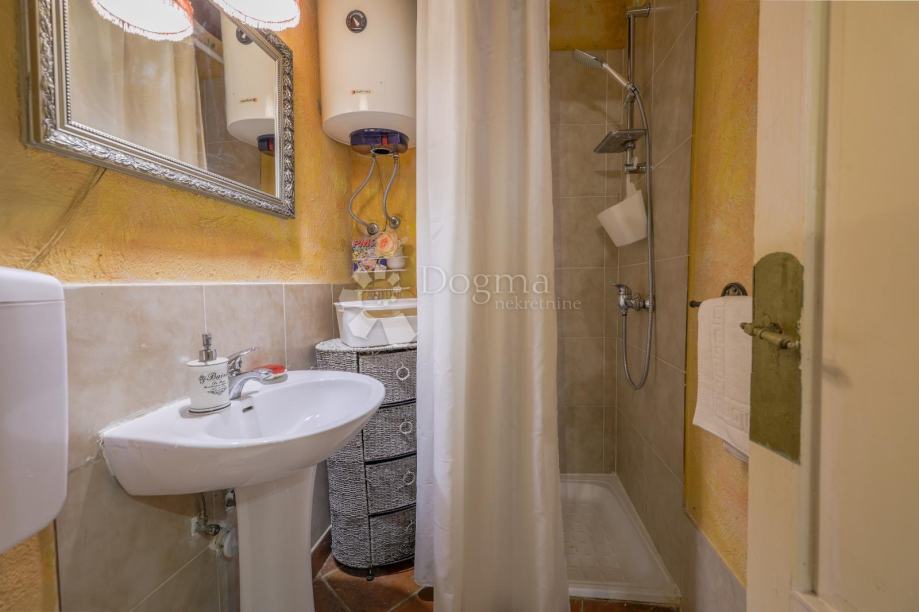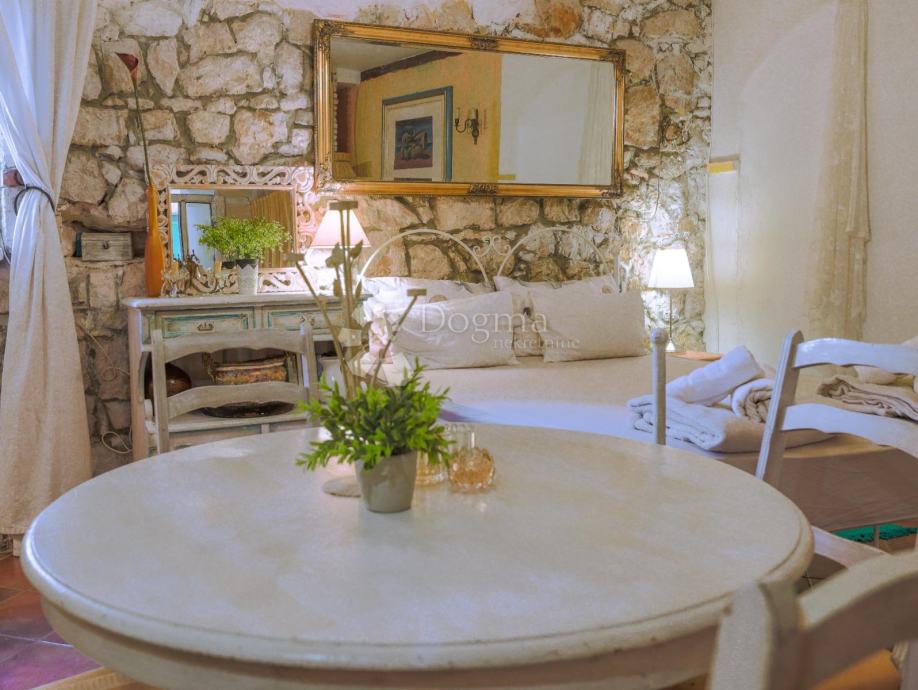 Smješten u prizemlju kamene kuće, apartman odiše pravim mediteranskim šarmom. Već pri ulasku do izražaja dolazi pod obložen toplim terakota pločicama koje prostoru daju rustikalnu eleganciju i dugotrajnu vrijednost. Impresivni kameni zidovi, sačuvani u izvornom obliku, naglašavaju autentičnost starogradske gradnje i stvaraju ambijent koji je danas gotovo nemoguće replicirati.
