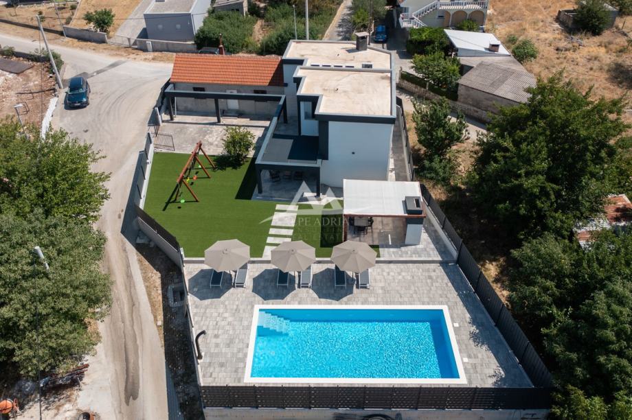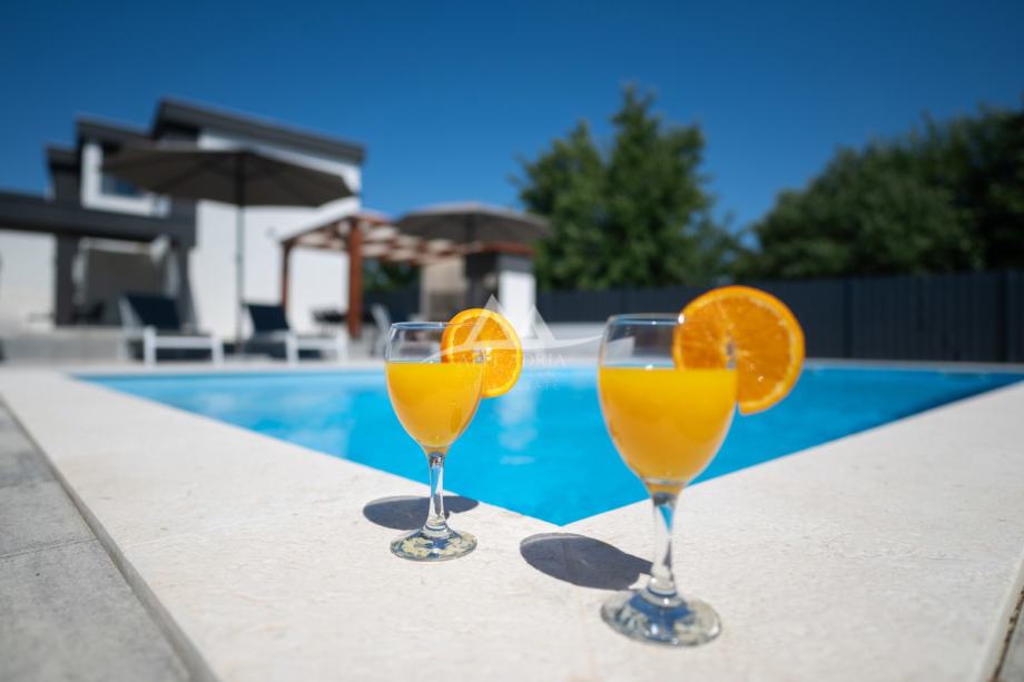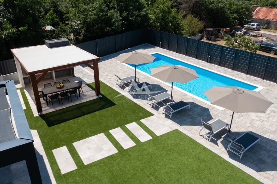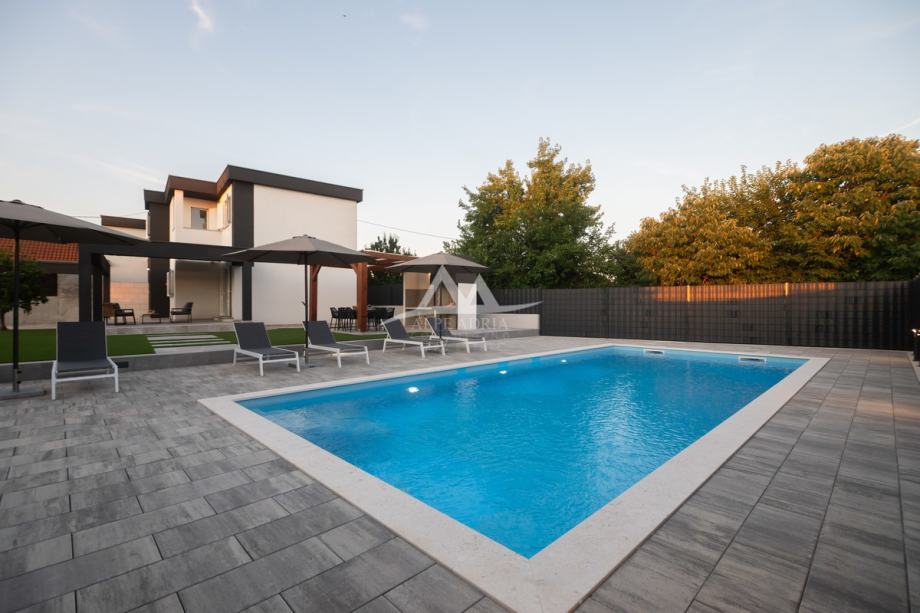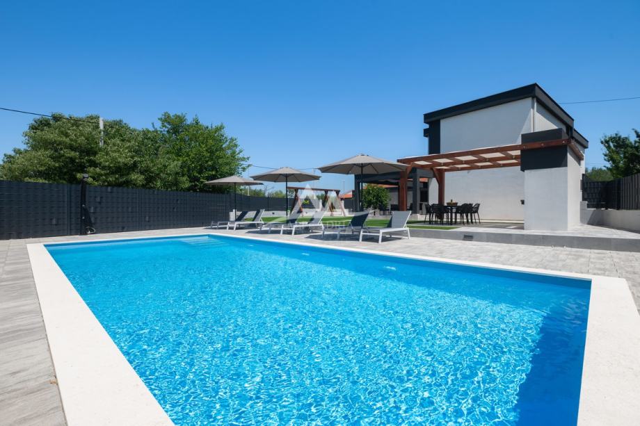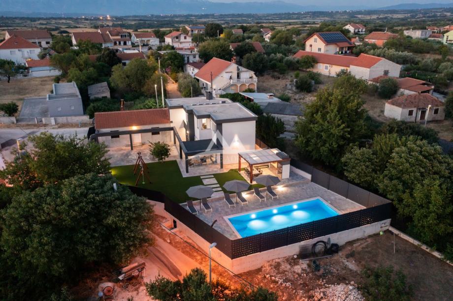 Prodaje se prostrana uređena kuća s bazenom i velikom okućnicom, ukupne bruto površine 220 m2, smještena na zemljištu površine 1.073 m2, u mirnom i zelenilom okruženom dijelu mjesta Suhovare, svega 15 minuta vožnje od Zadra.