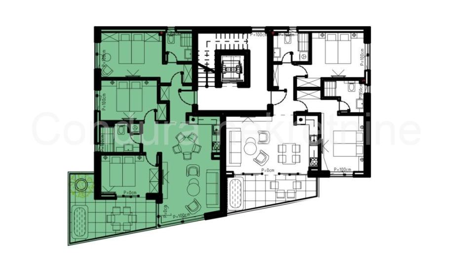 Neto površina apartmana iznosi 87,42 m2, a na priloženom tlocrtu označen je zelenom bojom.